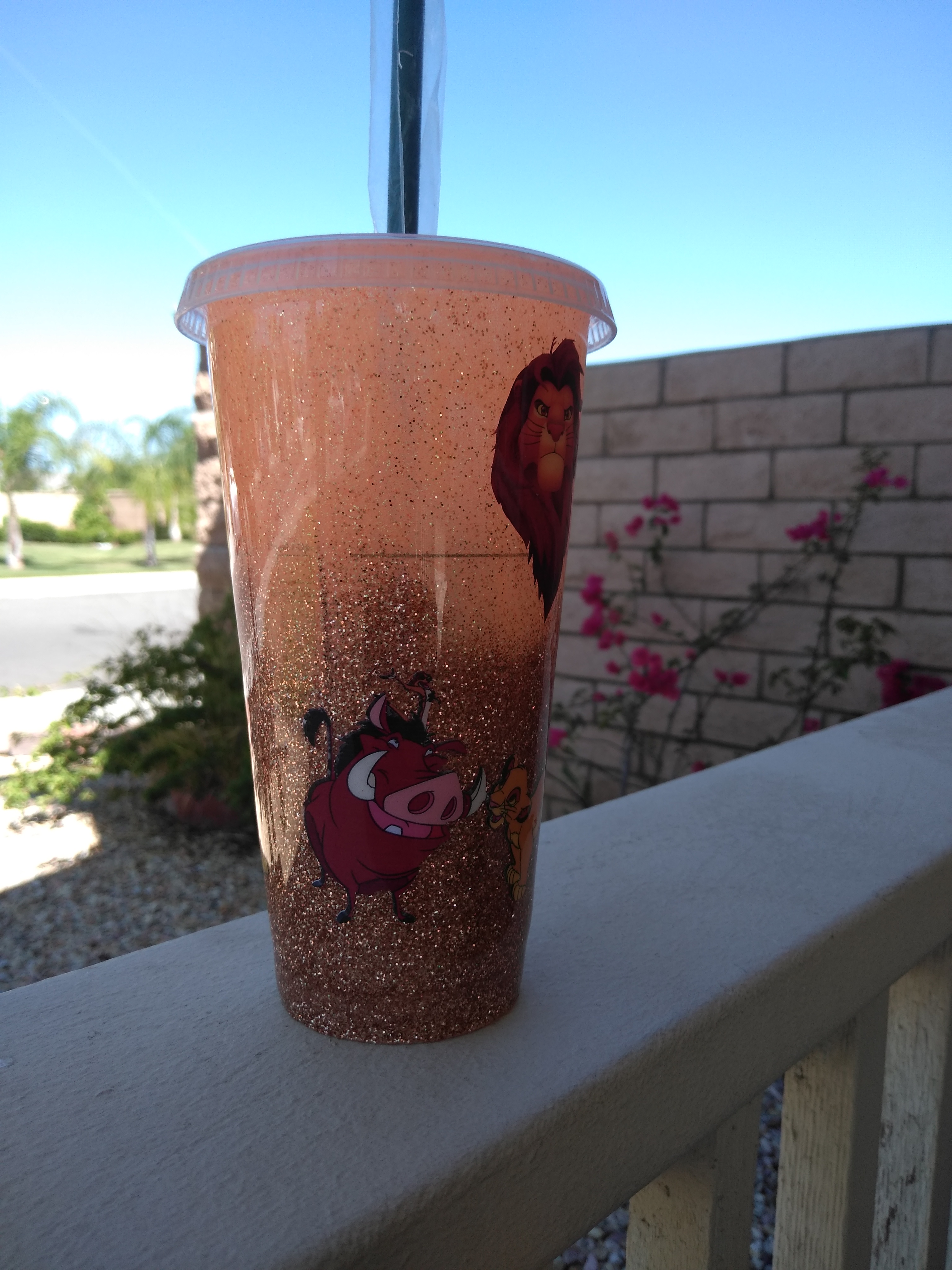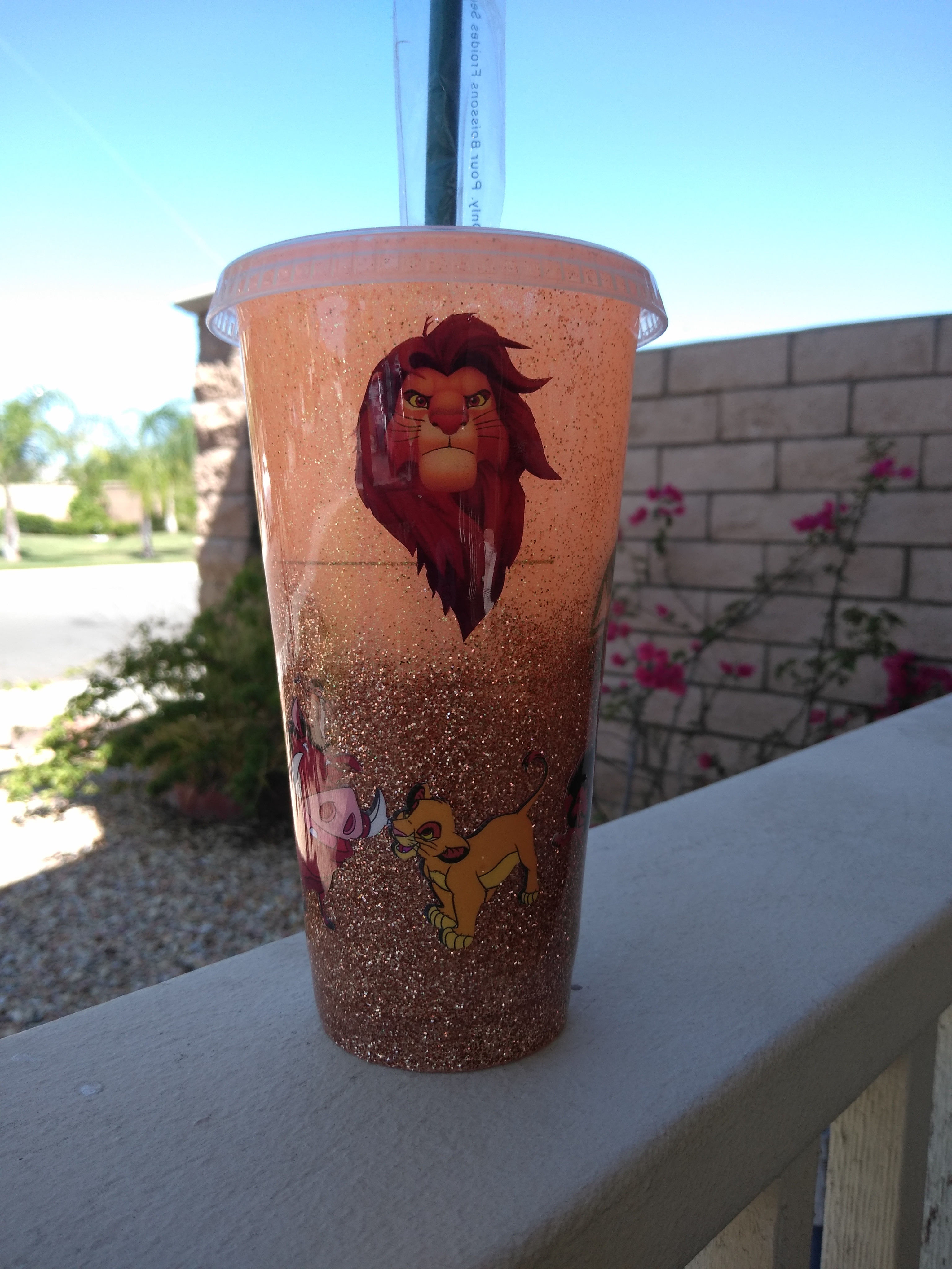 Starbucks reusable water cup Lion King Theme with Gold and orange glitter made to order orders take 1 to 2 weeks to finish and ship.