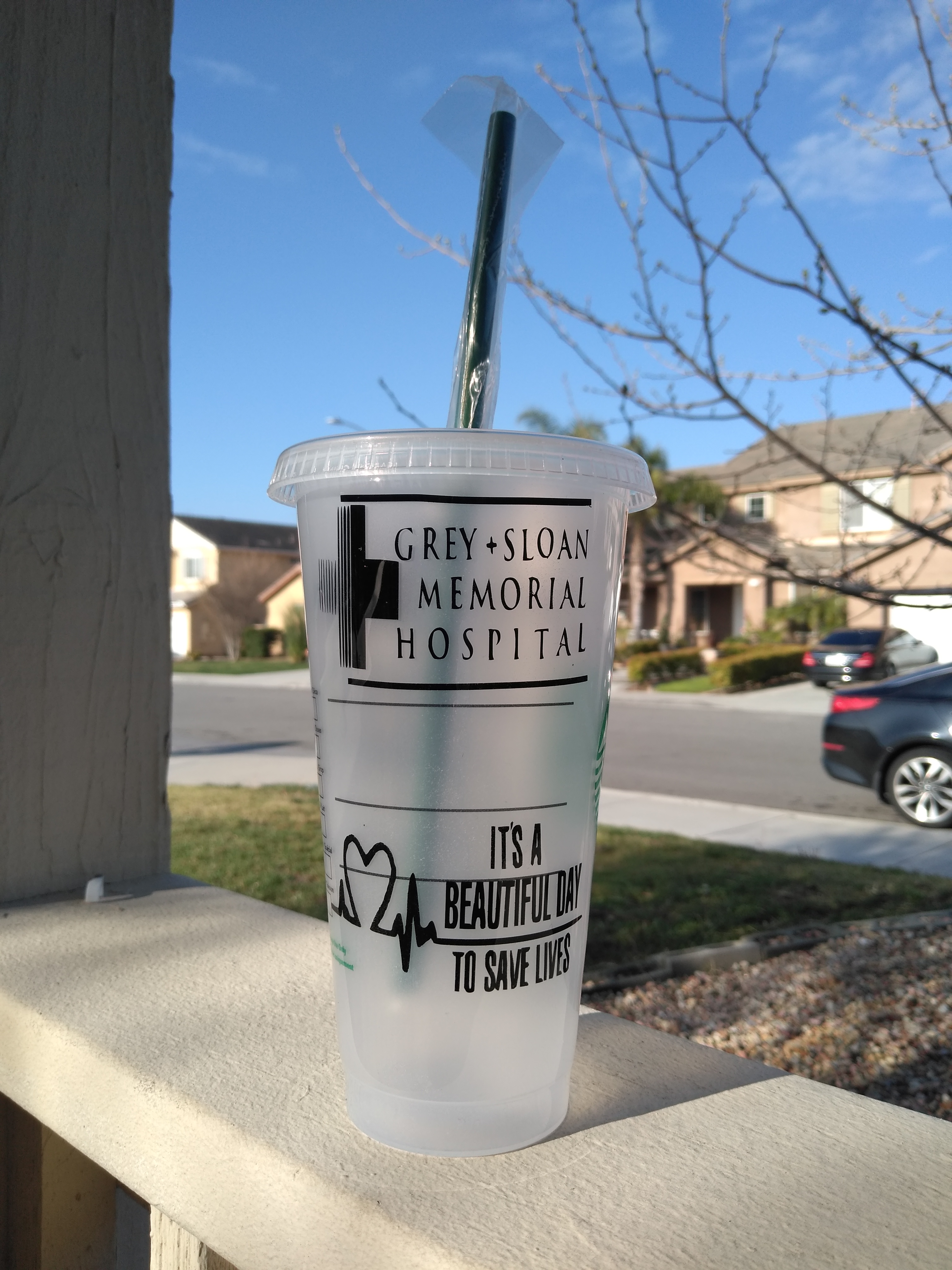 Starbucks reusable cup in Grey's anatomy quotes theme