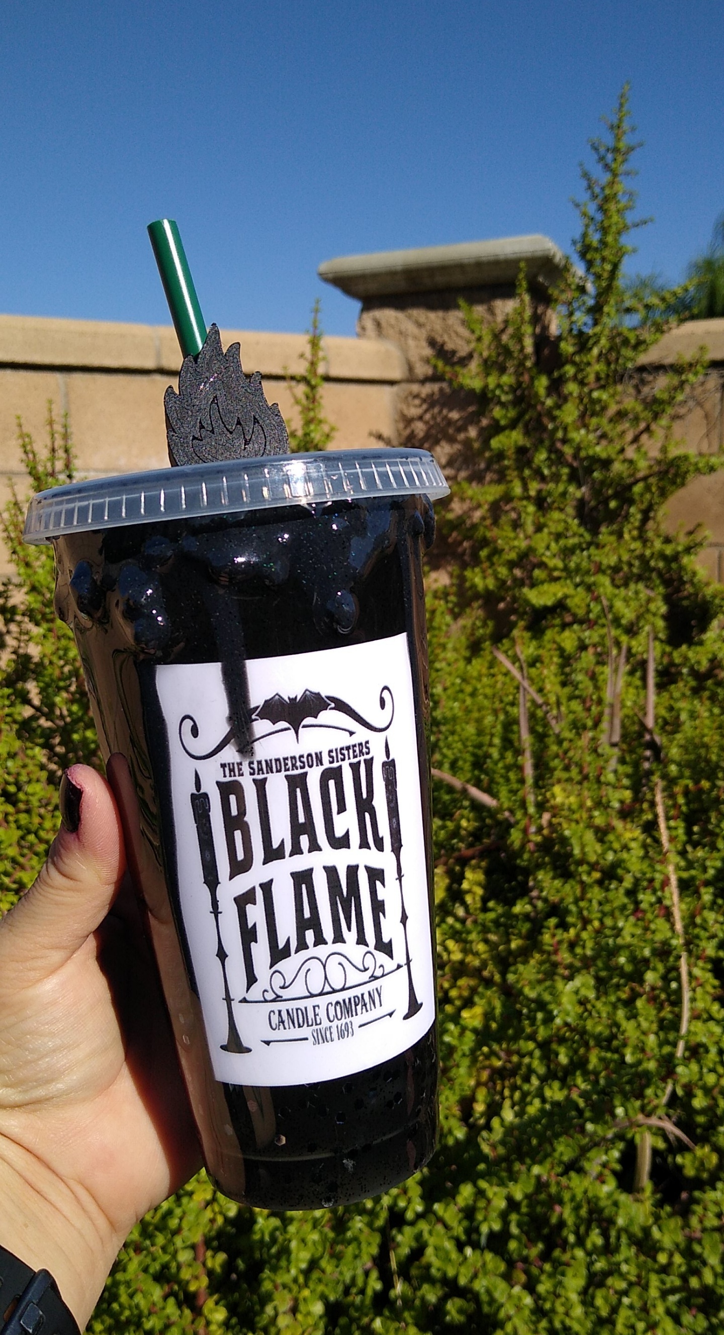 Hocus Pocus lovers here is a cup for you . Starbucks reusable cup in Black Flame candle theme with dripping hot wax from the hot black flame straw topper. You can get it with or without the flame straw topper. This item is made to order takes 1 to 3 weeks to finish and ship the starbucks logo will be covered .
