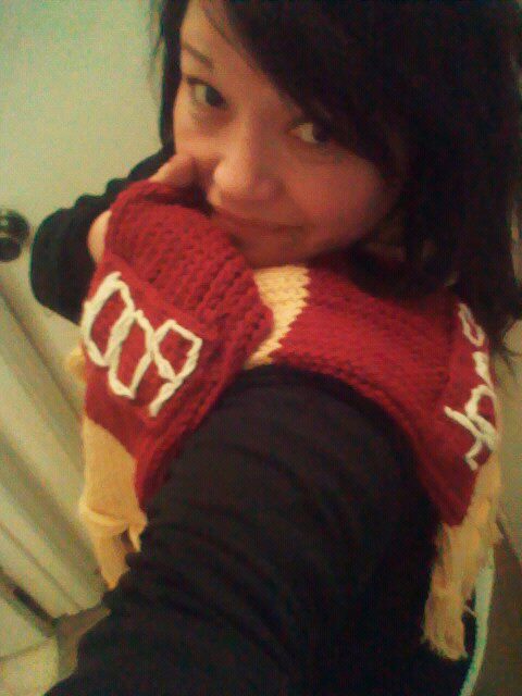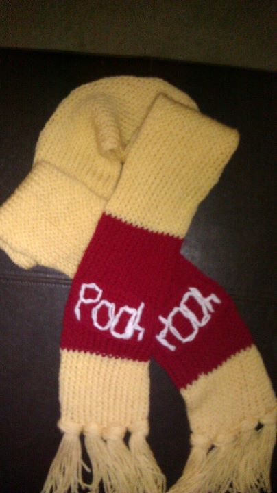Hand knitted Winnie the pooh inspired scarf made with soft yarn .