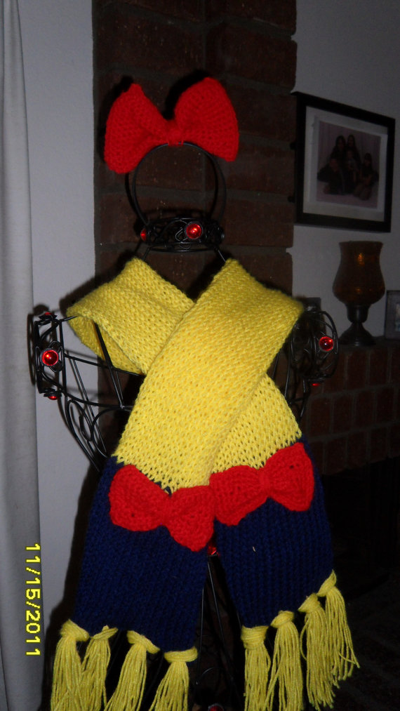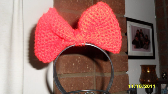 Hand knitted red bow on a black plastic headband goes great with the snow white inspired scarf sold separately all items made to order and you pick the color bow just let me know what color you would like at check out made to order orders take 1 to 3 weeks to finish and ship