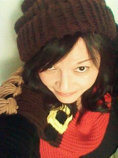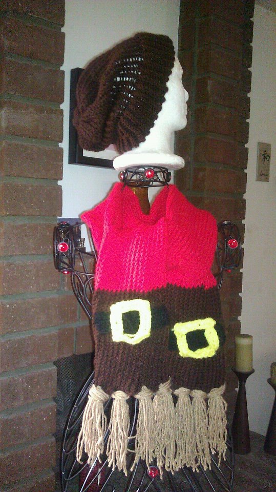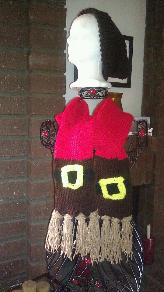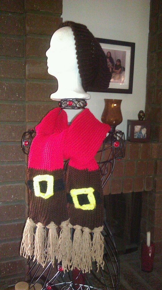 Hand knitted Grumpy inspired scarf and a brown crochet floppy beanie made with soft yarn .