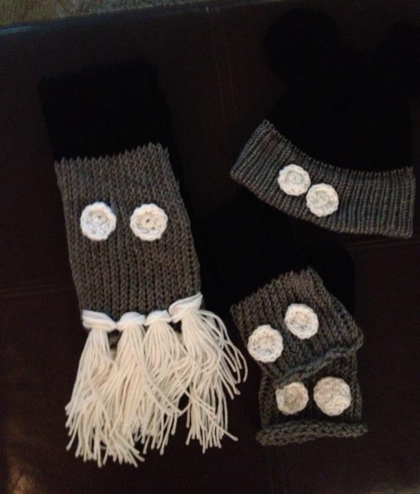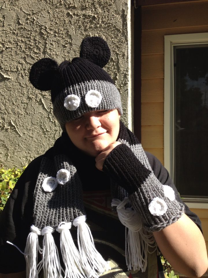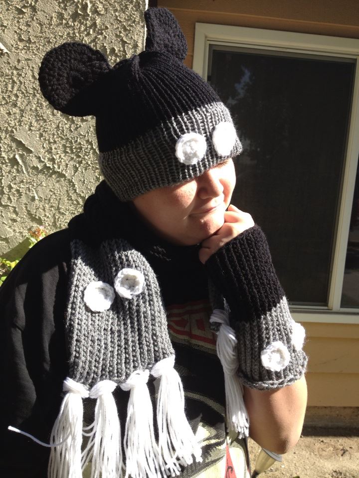 Hand knitted Steamboat Willie inspired scarf beanie and fingerless gloves made with soft yarn .