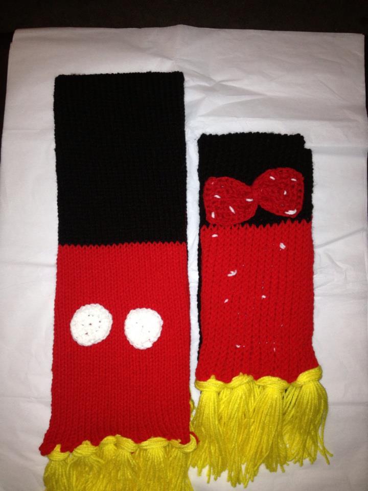 Hand knitted His and hers Mickey and Minnie inspired scarf made with soft yarn .