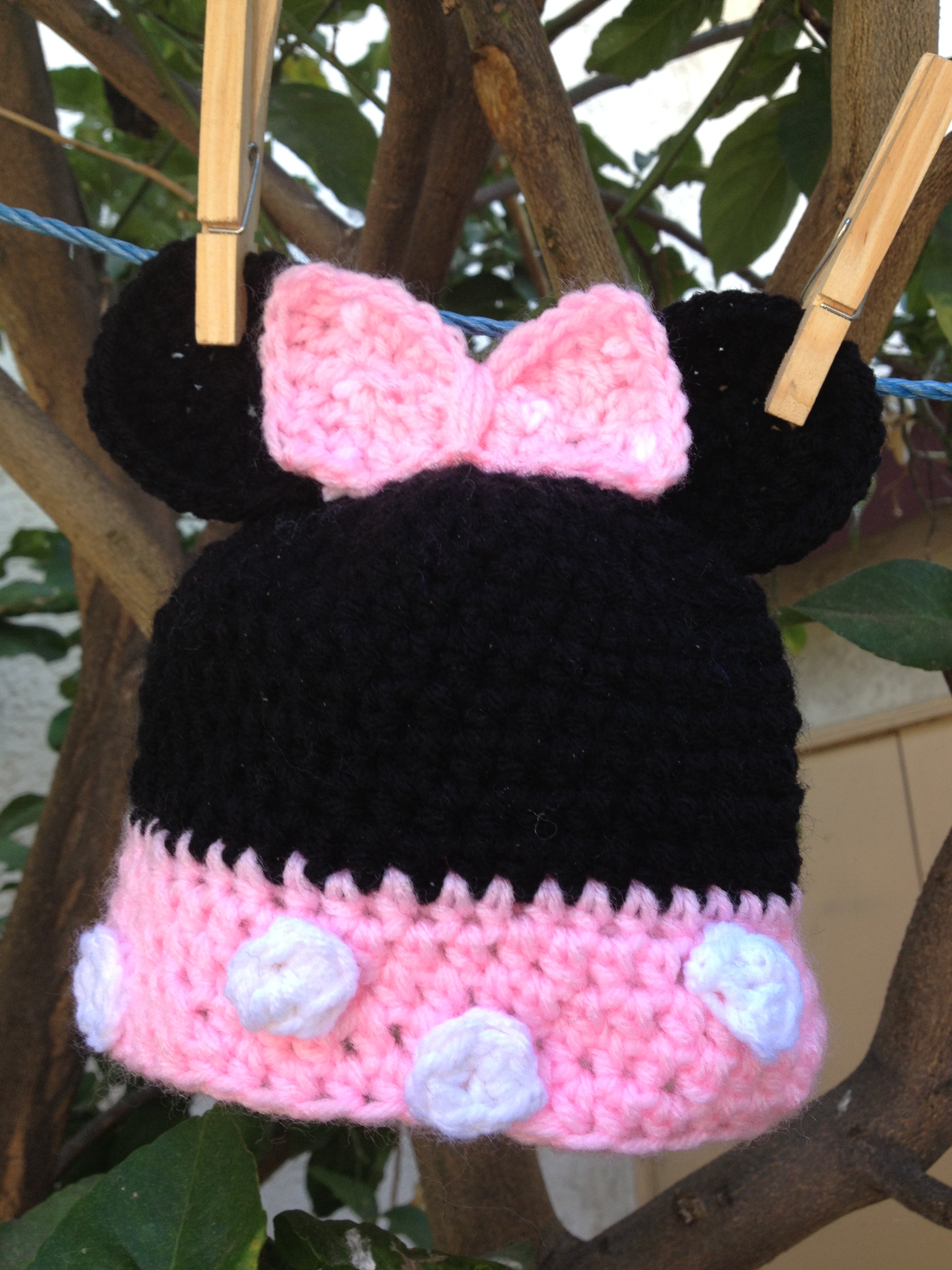 Crochet Minnie mouse inspired beanie in black and pink yarn with white crochet polka dots