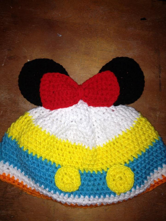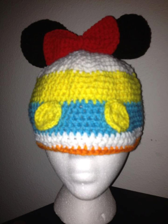 This beanie is White blue and yellow with Mickey inspired ears and a red bow