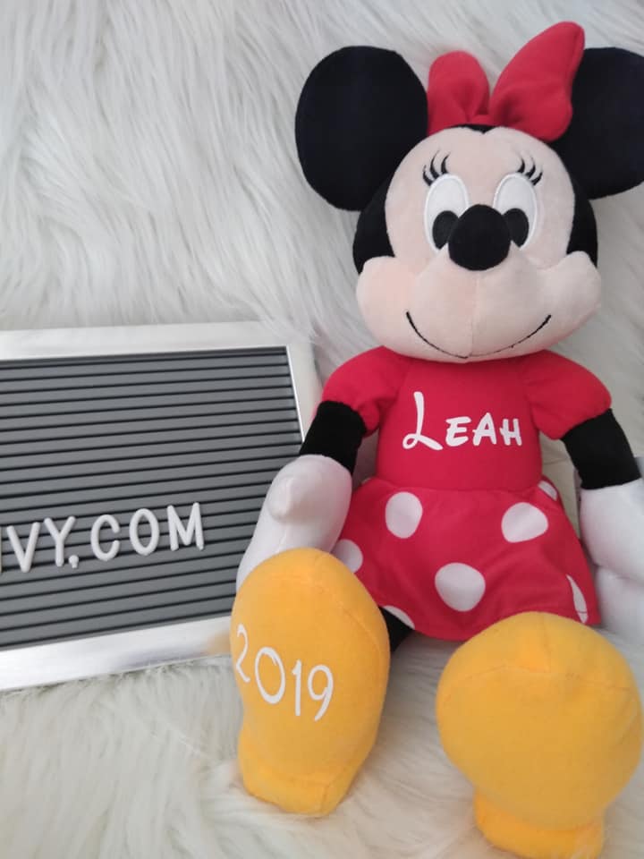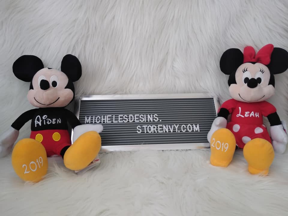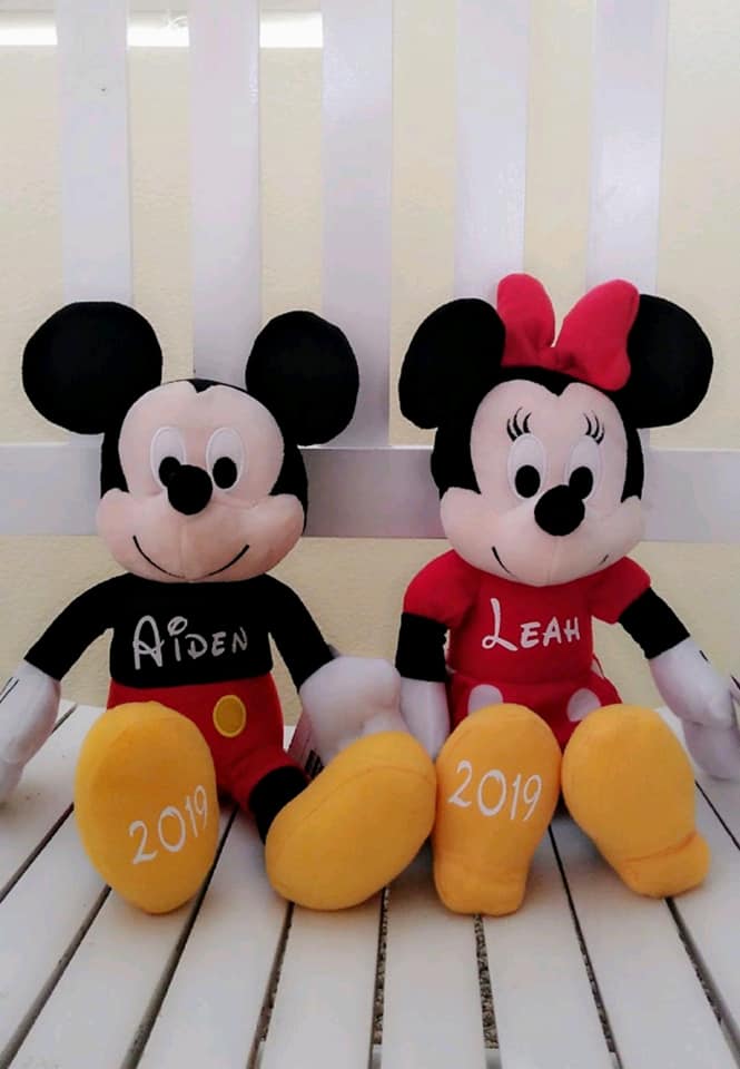 Perfect for All ages Your choice of Mickey or Minnie Personalized with name and year if you would like to add something else let me know these cuties are 15 inch long perfect size ! Makes great gifts. Made to order ships in 3 to 5 days
