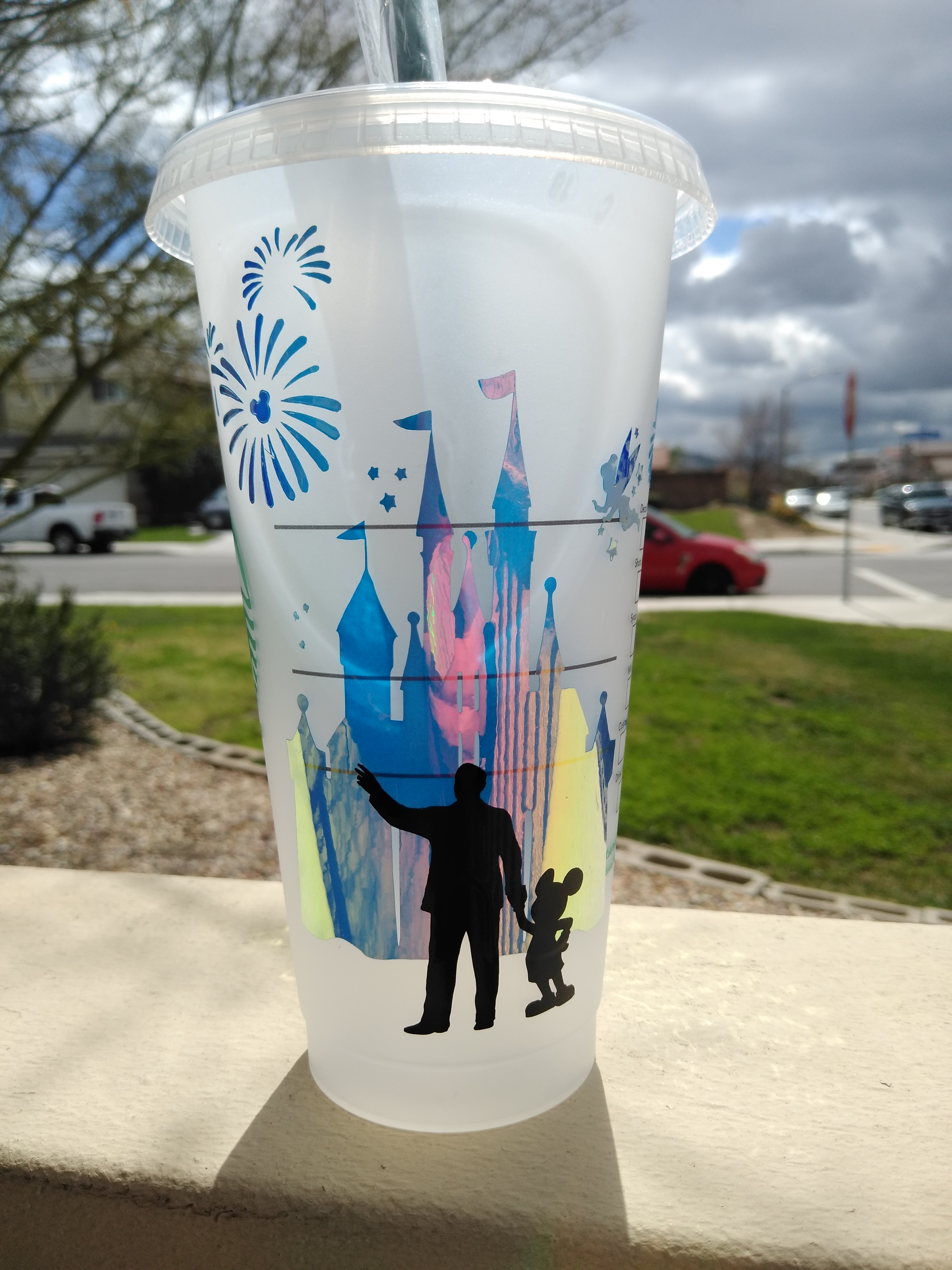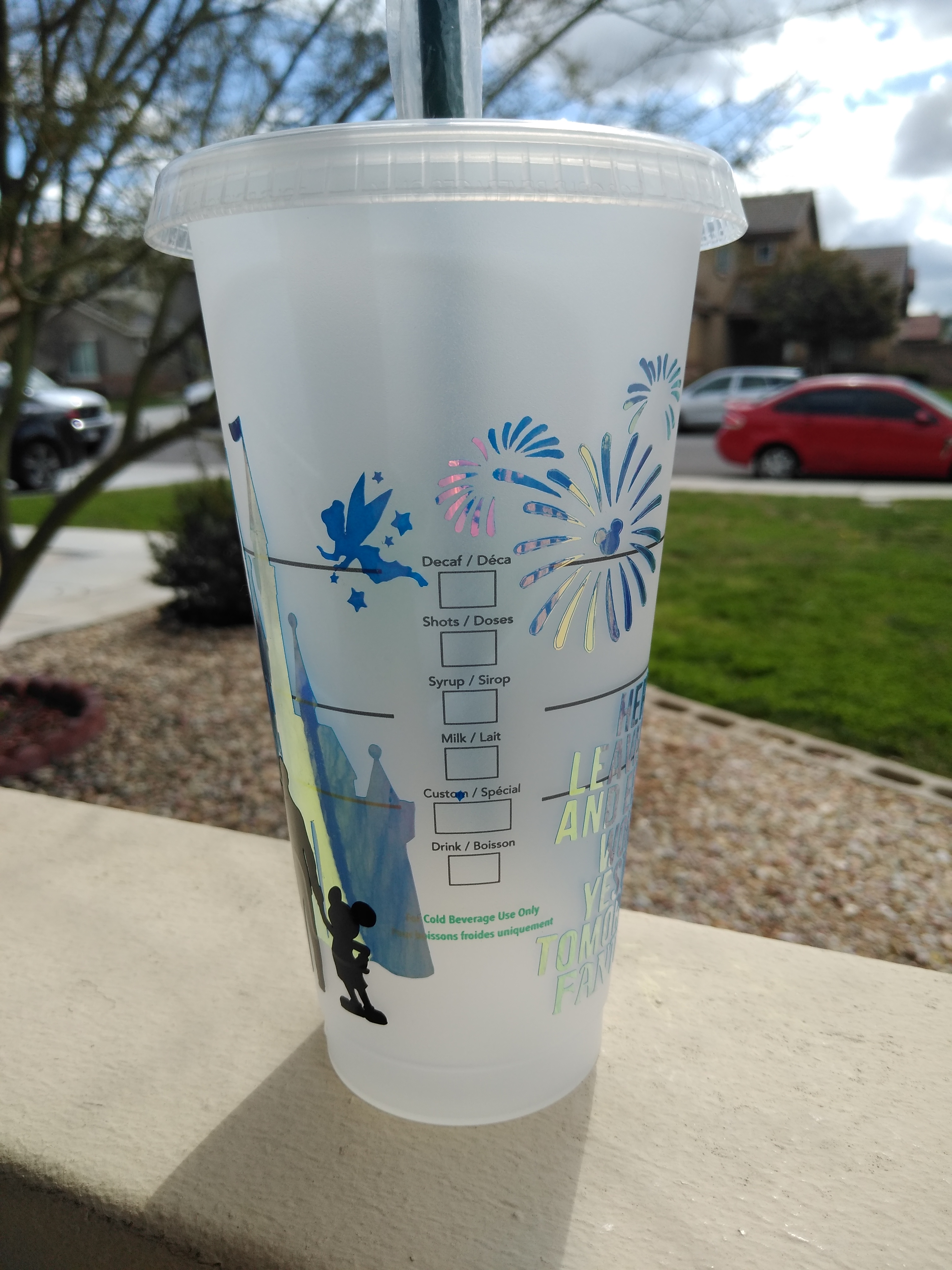 Starbucks reusable cold drink cups 24 oz Walt and Mickey inspired with fireworks tinkerbell and the saying "Here you leave today and enter the world of yesterday tomorrow and fantasy ...Made to order ships in 3 to 6 days can be personalized with your name.