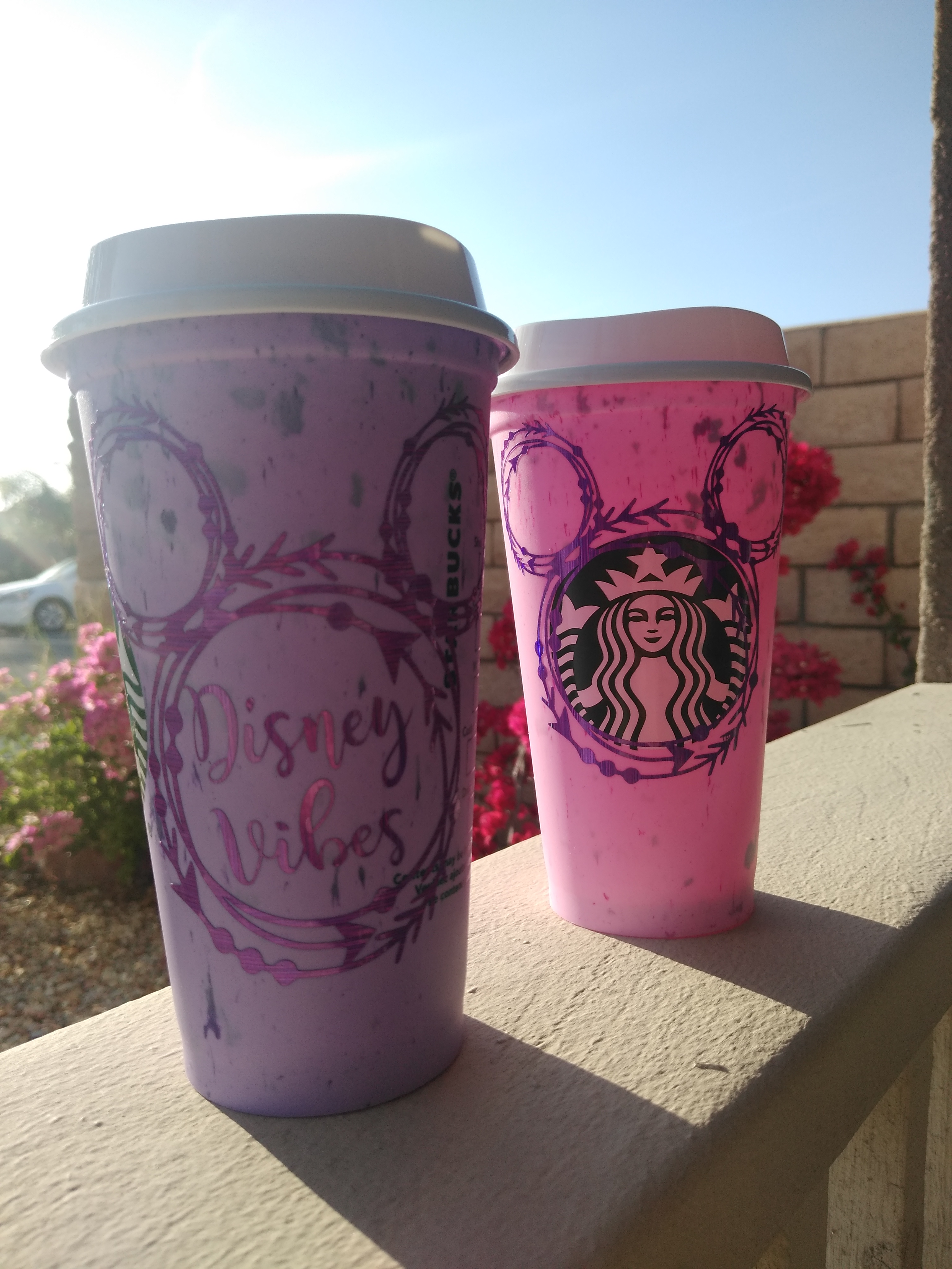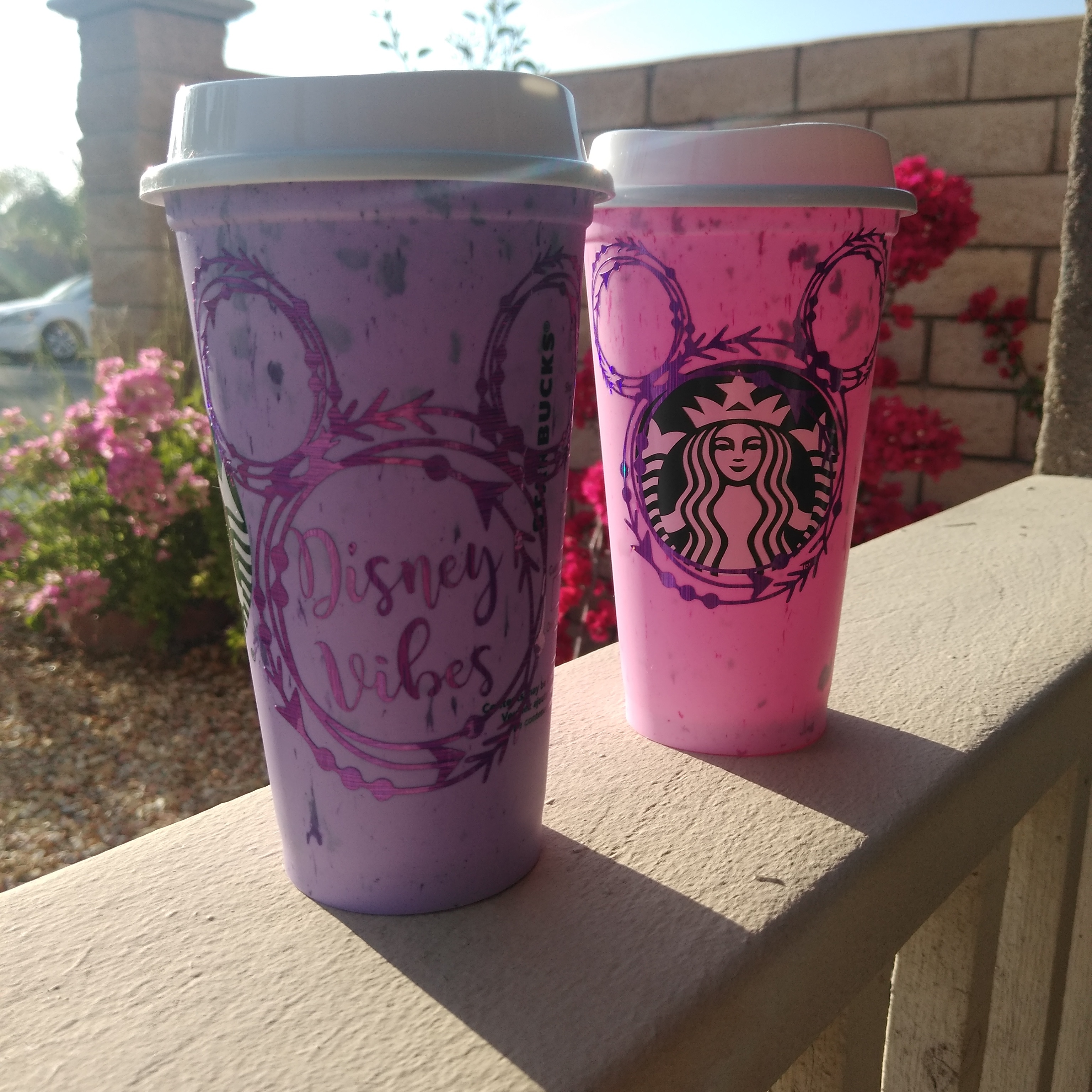 Starbucks reusable coffee cups in Purple or Pink Disney Vibes and mickey head around starbucks logo. Ships in 3 to 9 days .
