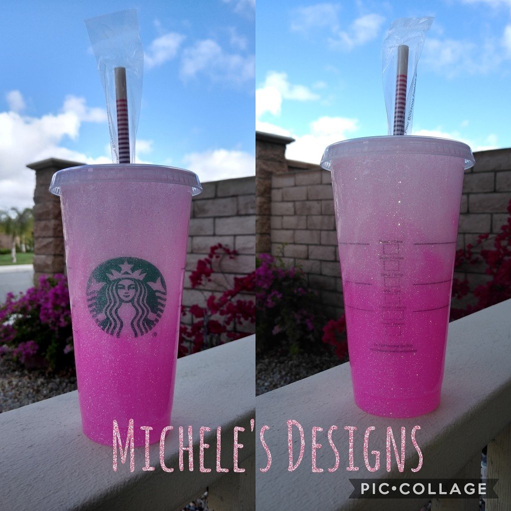 Cute Starbucks reusable cold cup with ombre pink glitter. Super cute just by its self or you can add decals ,or Name or your personal pictures to it . made to order drders take 2 to 3 weeks to finish and ship.