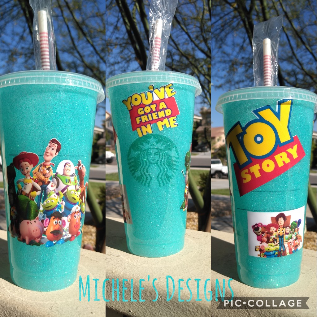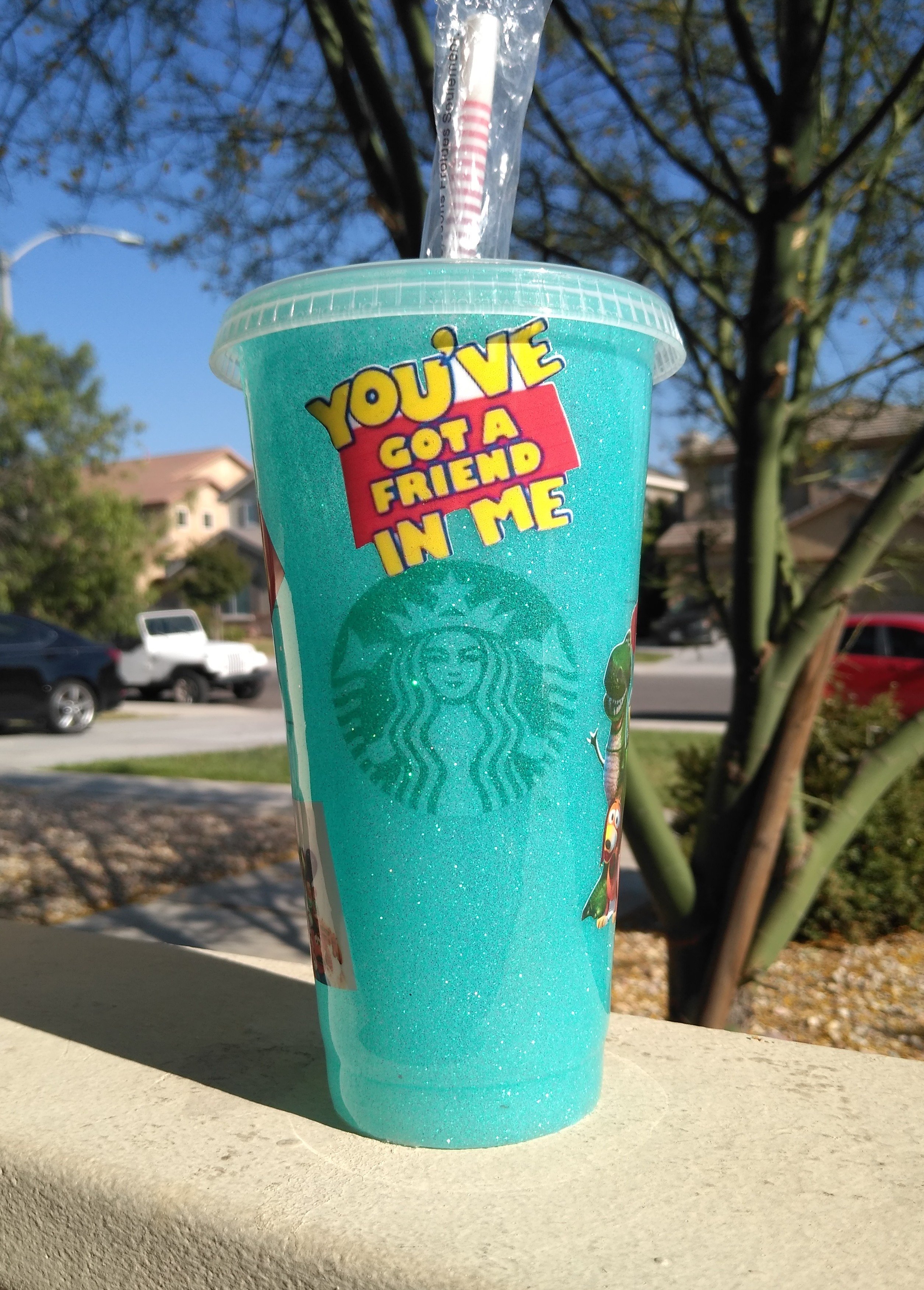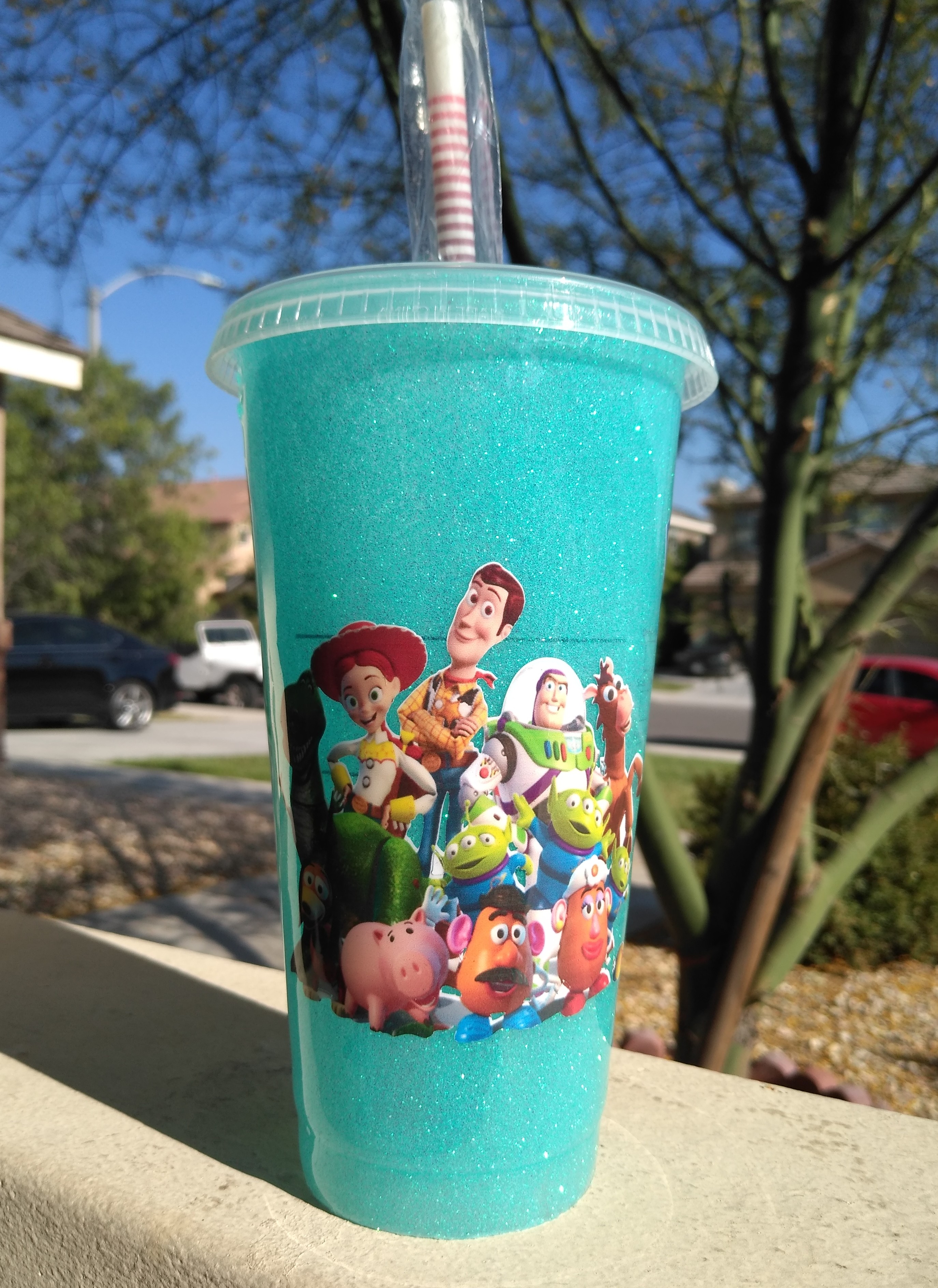 Starbucks reusable cold drinking cup Toy Story inspired theme with teal blue glitter these cups are made to order and take 2 to 3 weeks to finish and ship. If you would like your name added please add it to notes at checkout