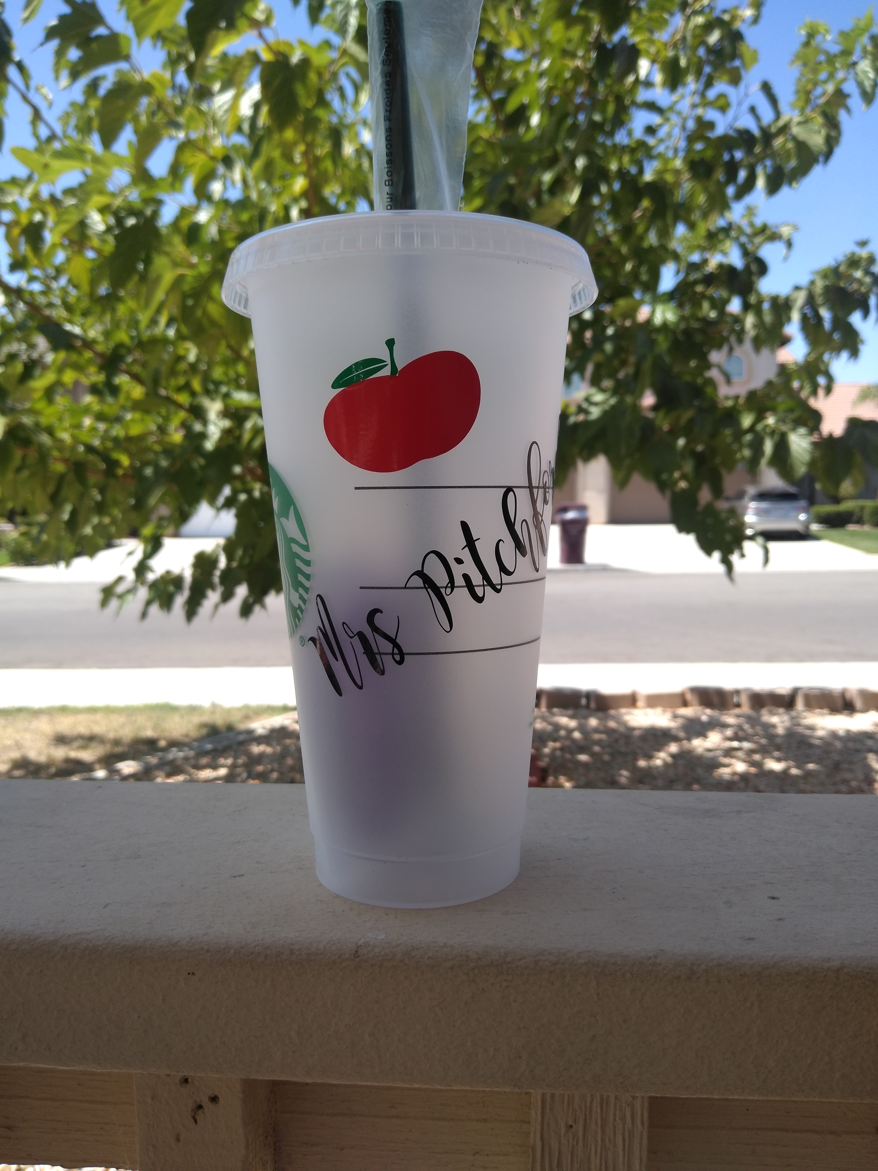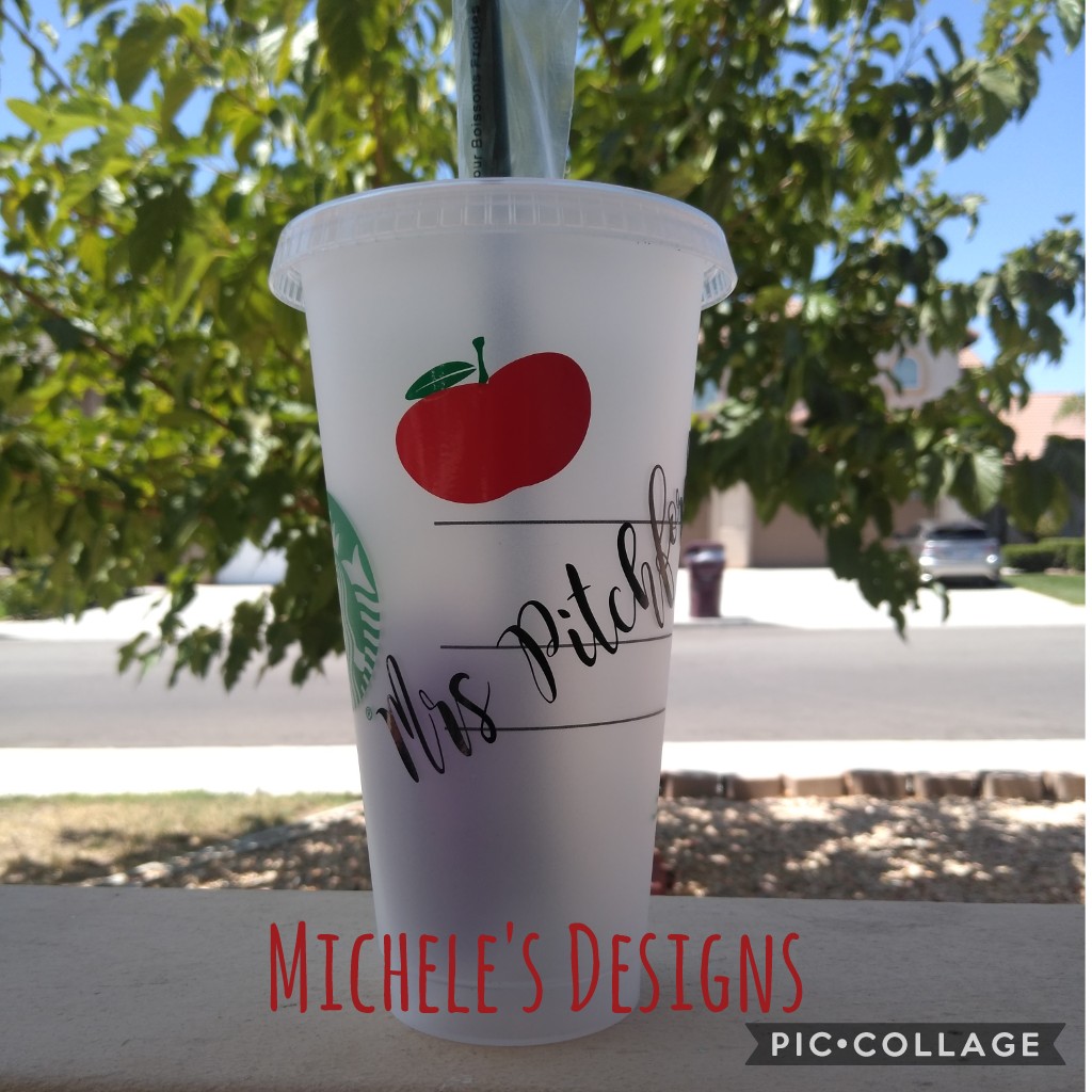 Starbucks reusable cup this one in a teacher theme with name and apple. Made to order orders take 1 to 2 weeks to finish and ship please be sure to add name you would like on cup in the notes at checkout to avoid delays .
