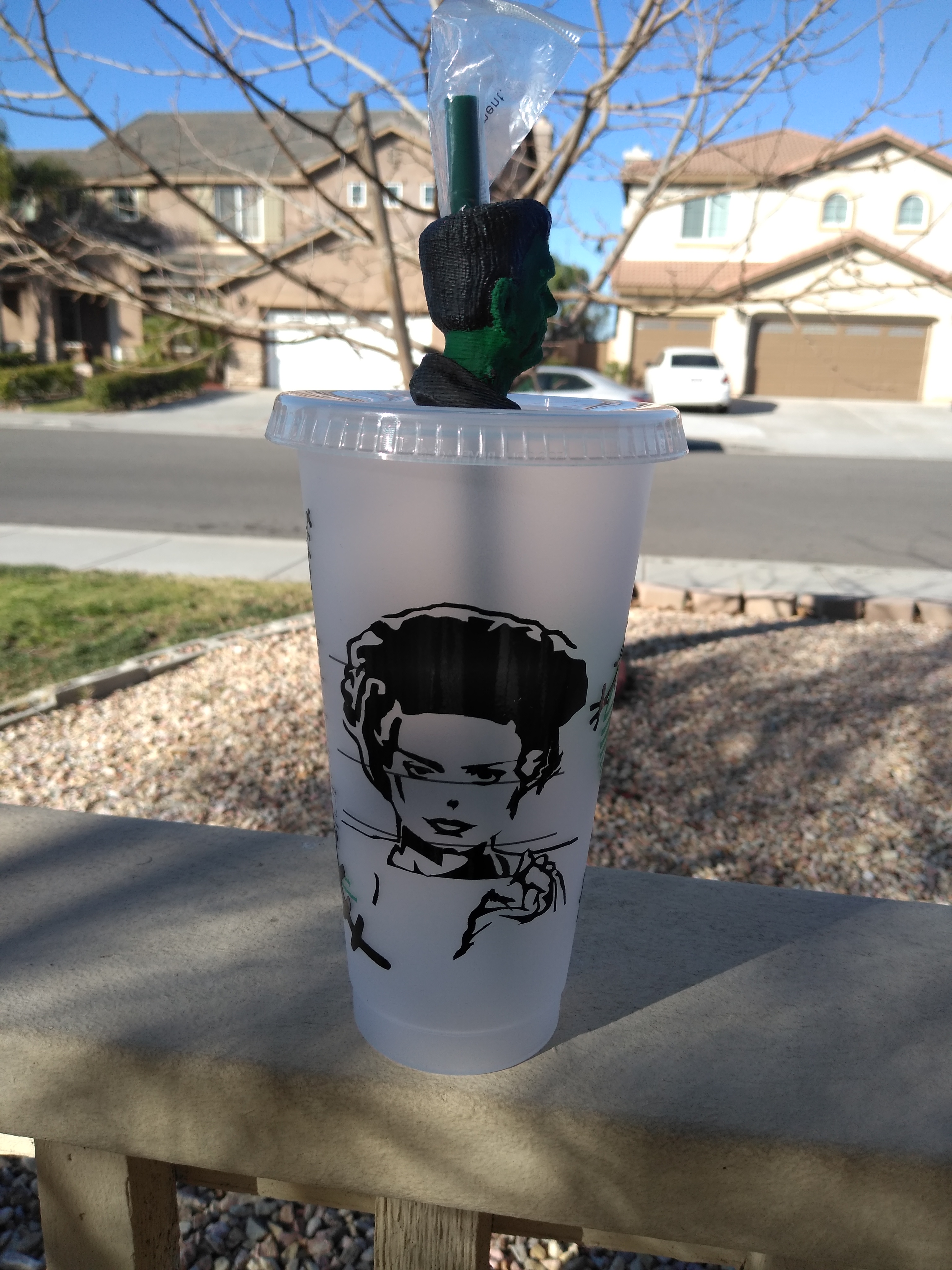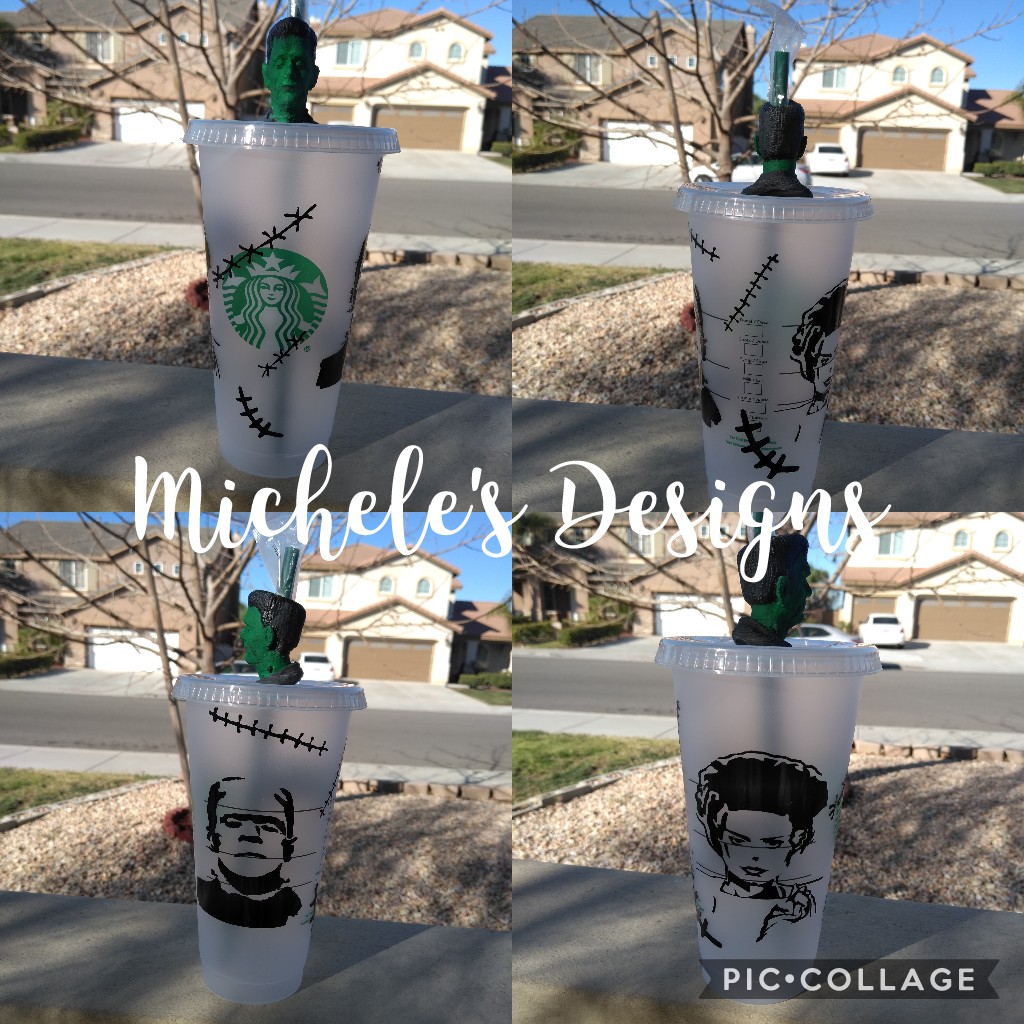 Starbucks reusable cup with Frankenstein and his Bride also has scars around the cup. straw topper is sold separately but you do get it cheaper when you get the cup and topper together Ships in 1 to 2 weeks.