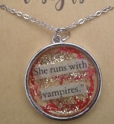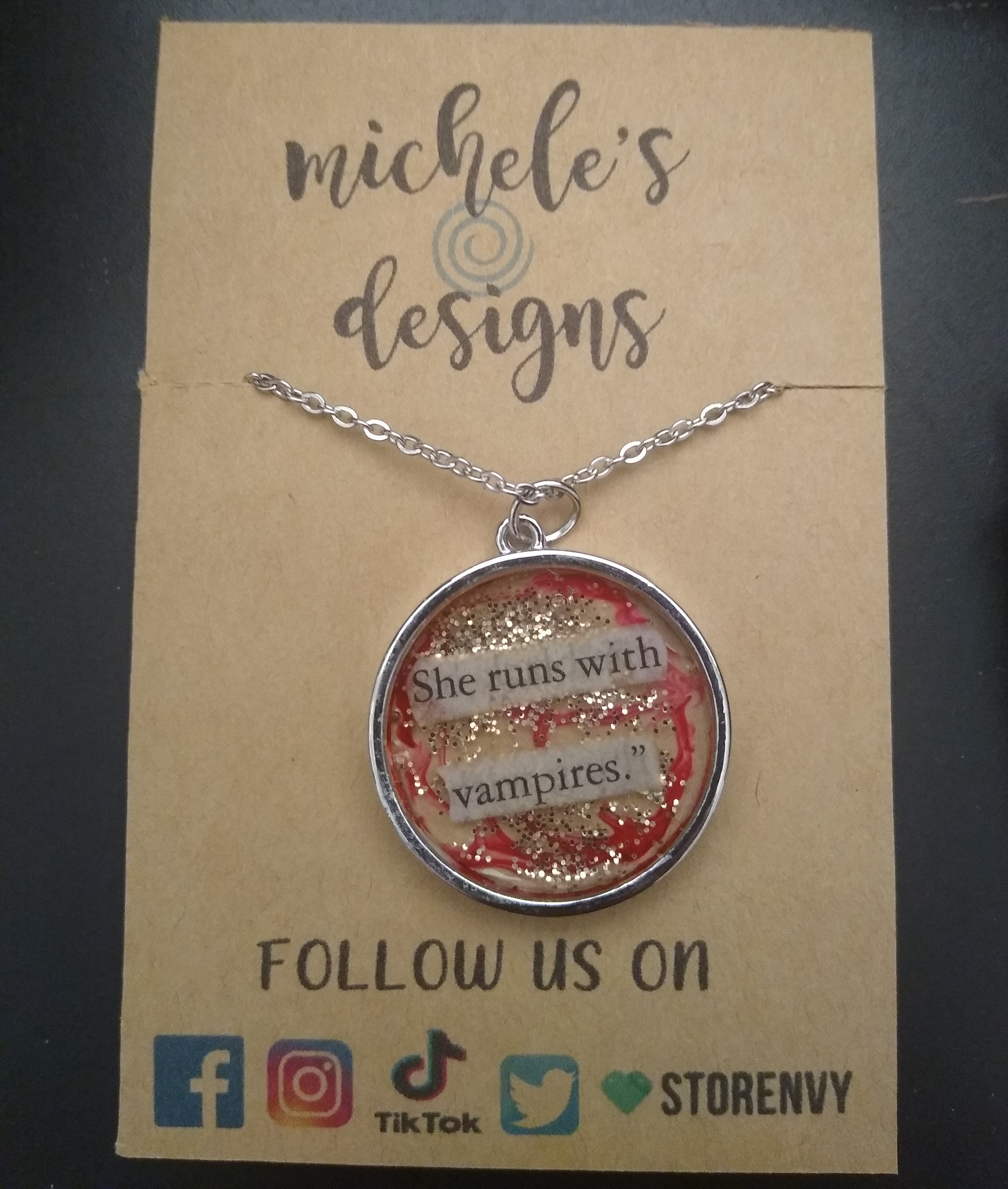 She runs with vampire's strait from New Moon book . This Book page jewlery is on a bezel pendent with gold glitter and also red ink also comes with a 18" Silver Stainless Steel chain.shios in 2 to 3 day limited supply due to coming from a book. Follow me on Instagram tiktok and Facebook all are @ michelesdesigns for restock notification.