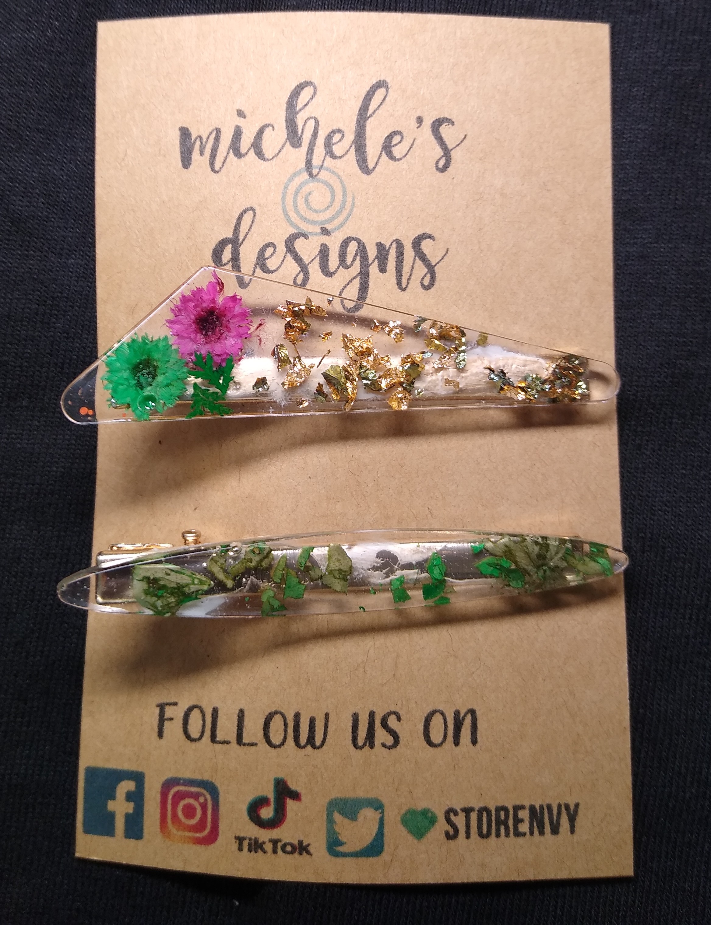 Two hair clips both clear with green leaves and smaller one has pressed flowers also. handmade with resin ready to ship