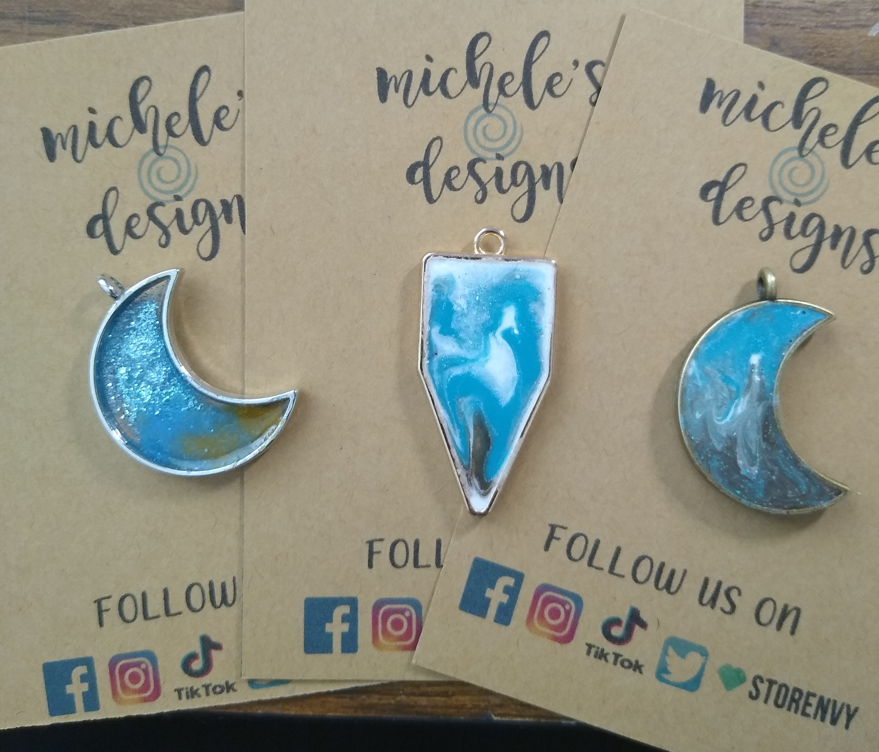 Blue and white jewlery is on a bezel pendent comes with a 18" Silver Stainless Steel chain. Made with paint and resin .ships in 2 to 3 day limited supply due to coming from a book. Follow me on Instagram tiktok and Facebook all are @ michelesdesigns for restock notification.