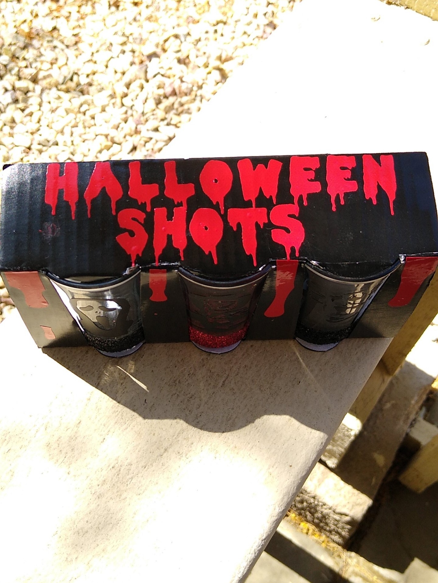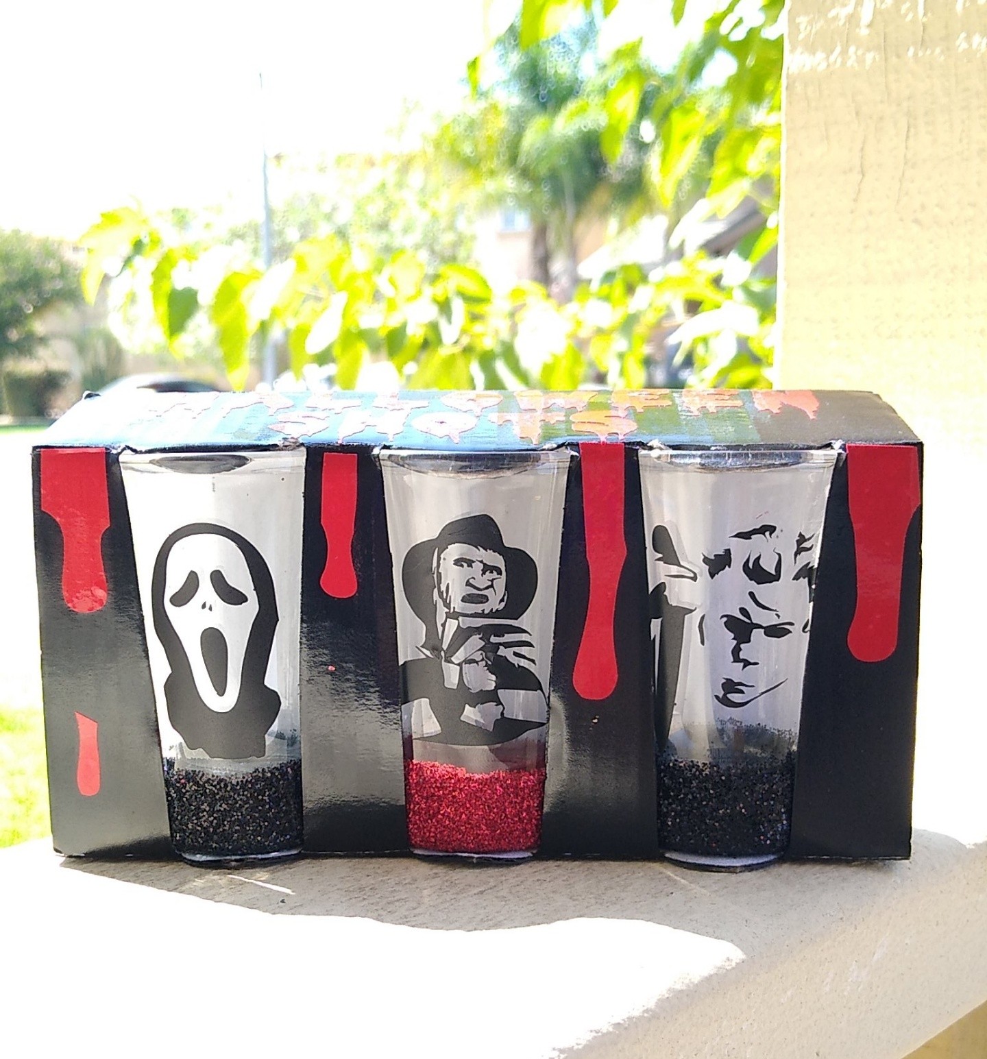 Handmade Halloween shot glasses perfect for a Halloween party . comes with 3 shot glasses Scream, Freddy and Michael Meyers. ready to ship