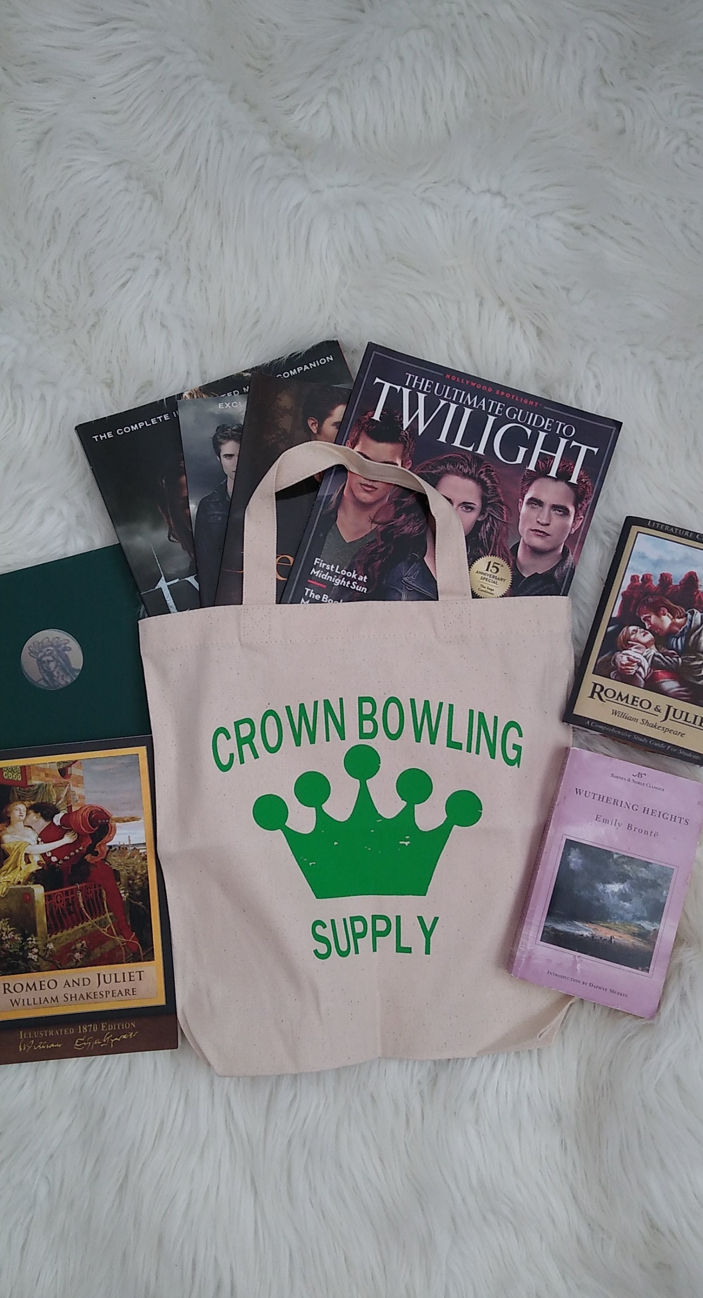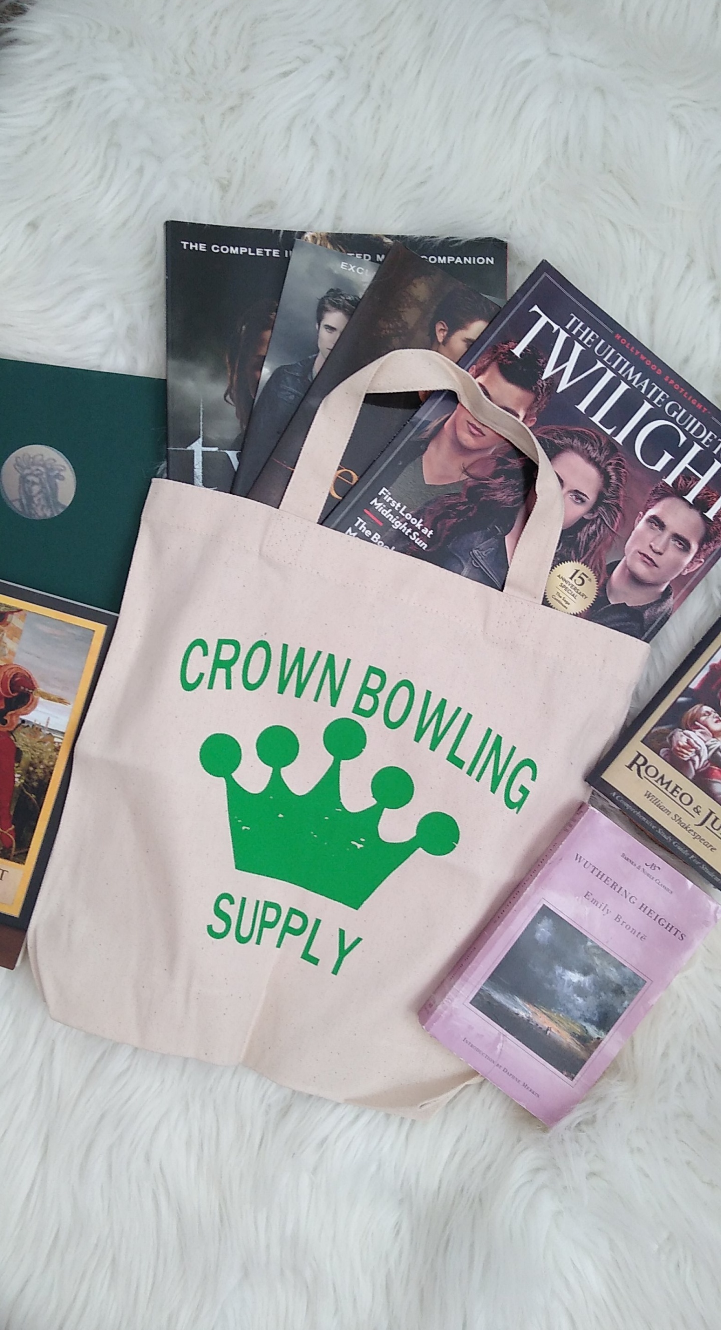 Twilight fans here you go Crown Bowling book bag size 13.5 X 13.5 fits a lot of things.ships in 1 to 2 weeks.