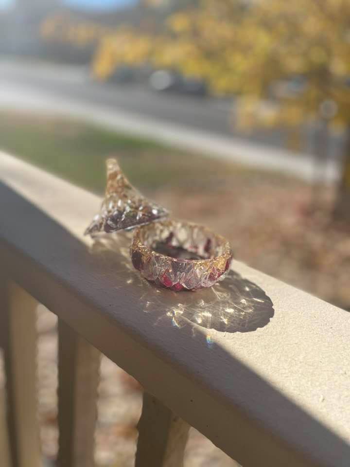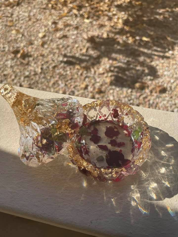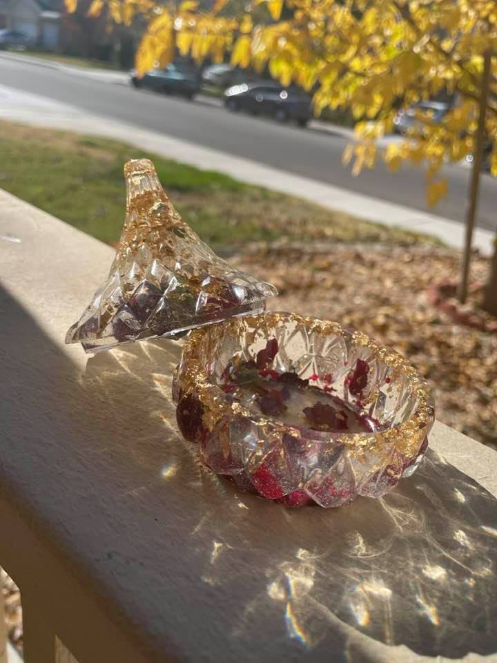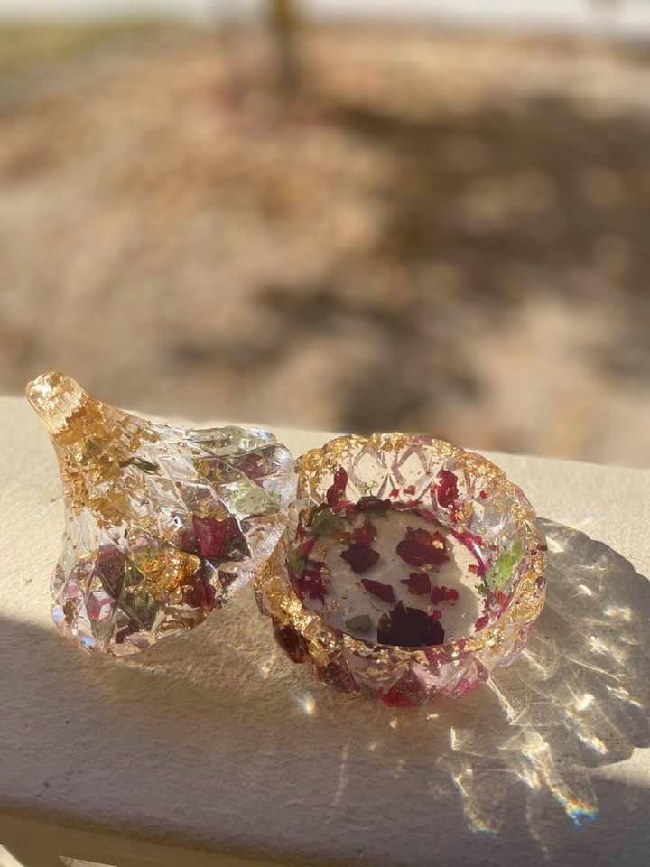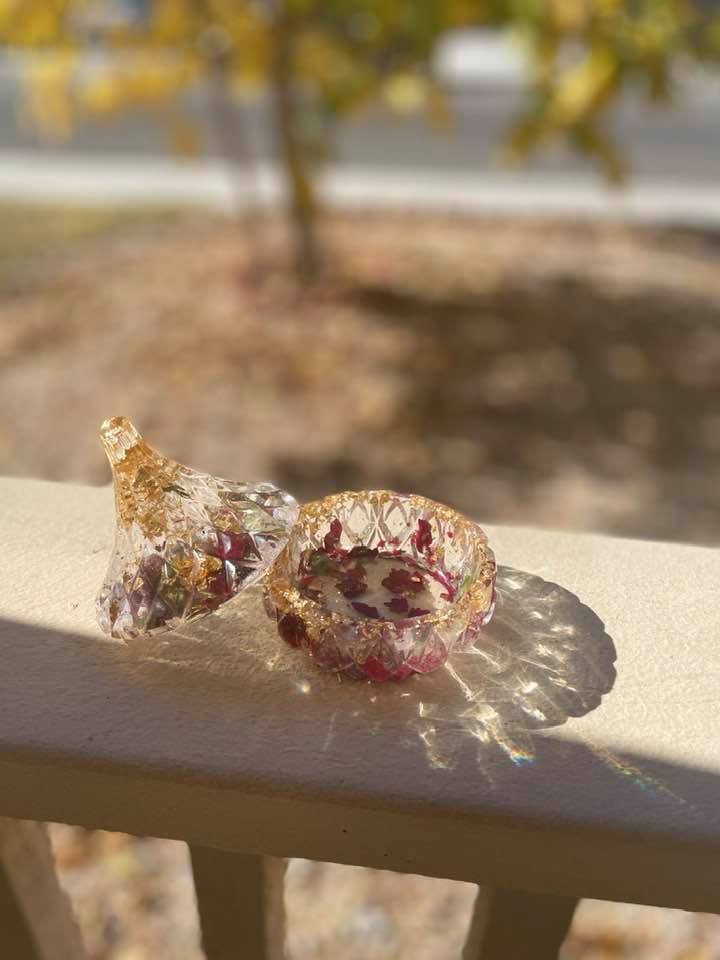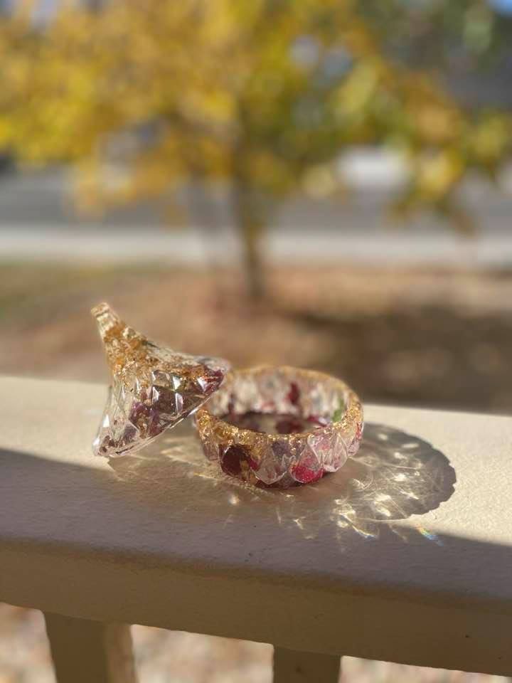 Carousel Trinket Jar this jar is perfect for ring earrings or anything you would like to keep safe Size 4X3 with lid on 1x3 with lid off. Made with dried flowers gold flakes and resin these are handmade and take 1 to 2 weeks to finish and ship.