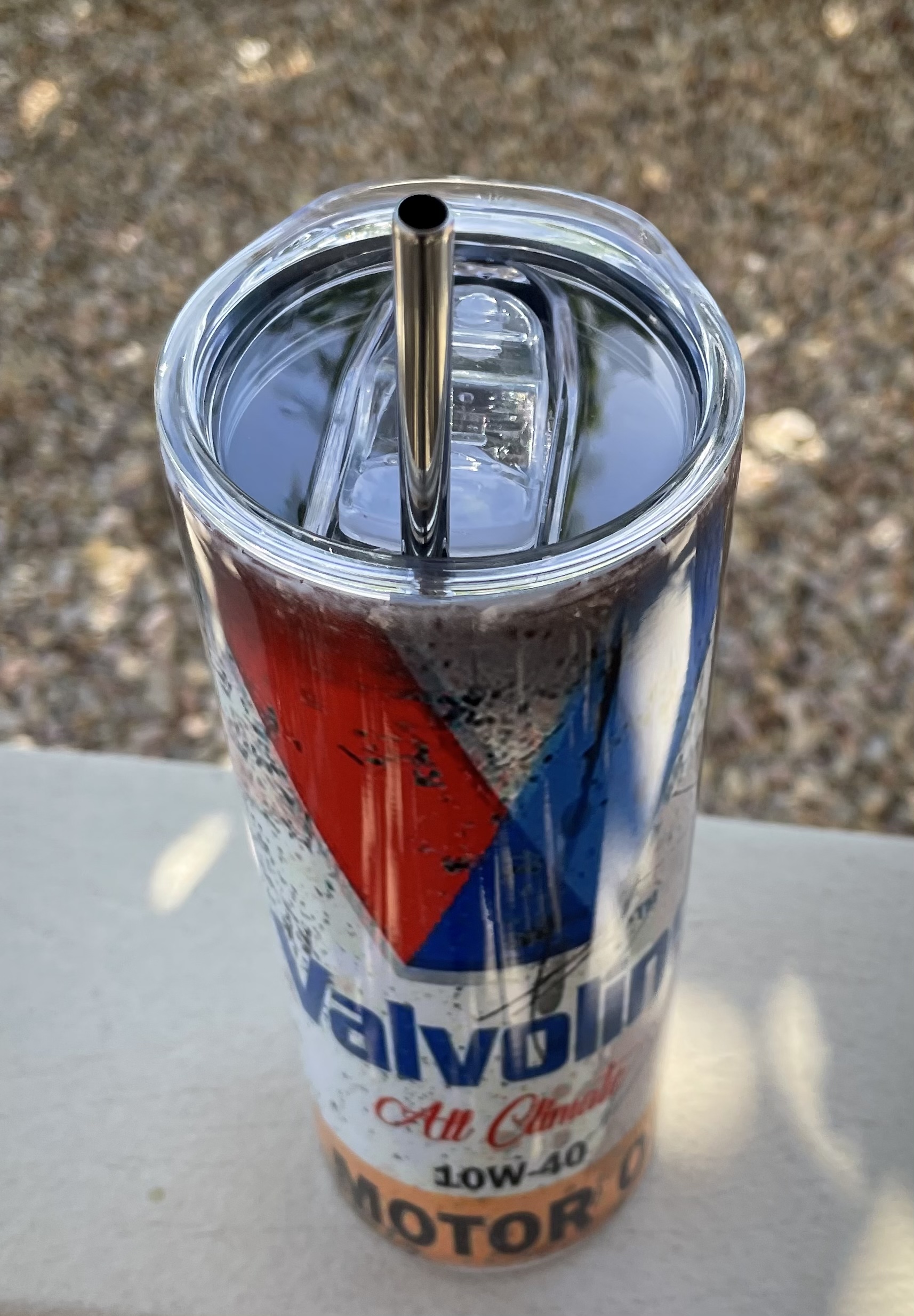 Valvoline motor oil inspired 20oz skinny tumbler. This is handmade with sublimation comes with a lid and metal straw makes a perfect gift. ships in 1 to 2 weeks