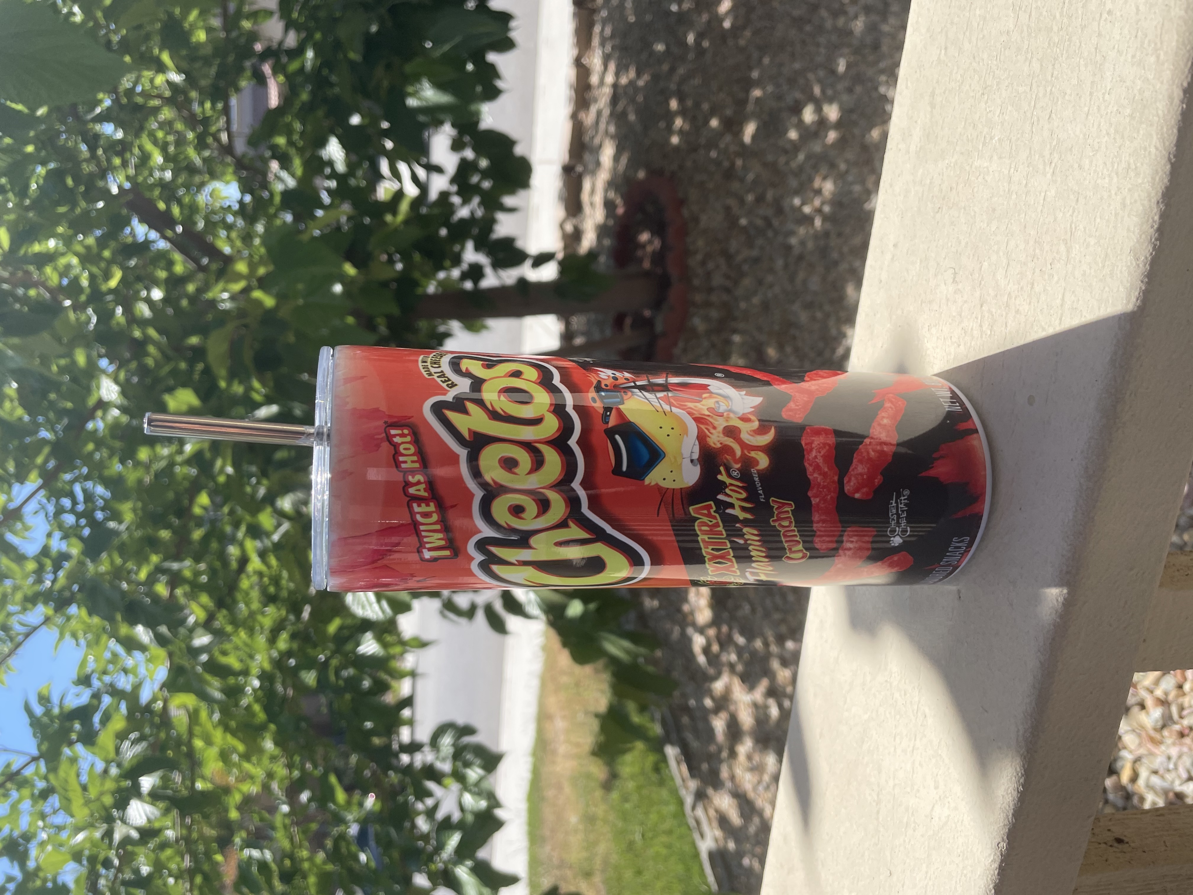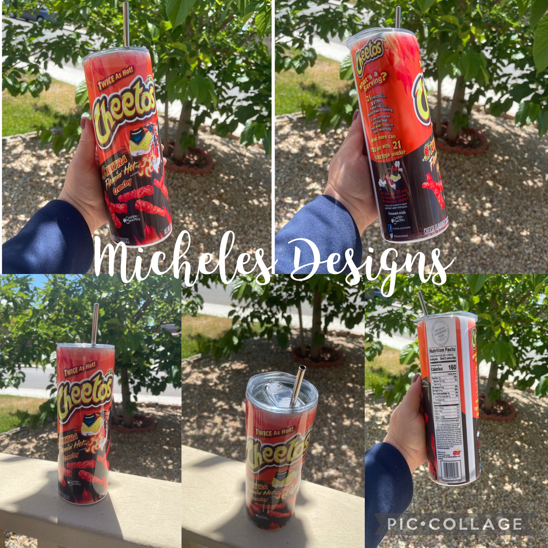 XXTRA Flaming Hot Cheetos this tumbler is handmade size is 20oz comes with lid and metal straw. Ships in 1 to 2 weeks