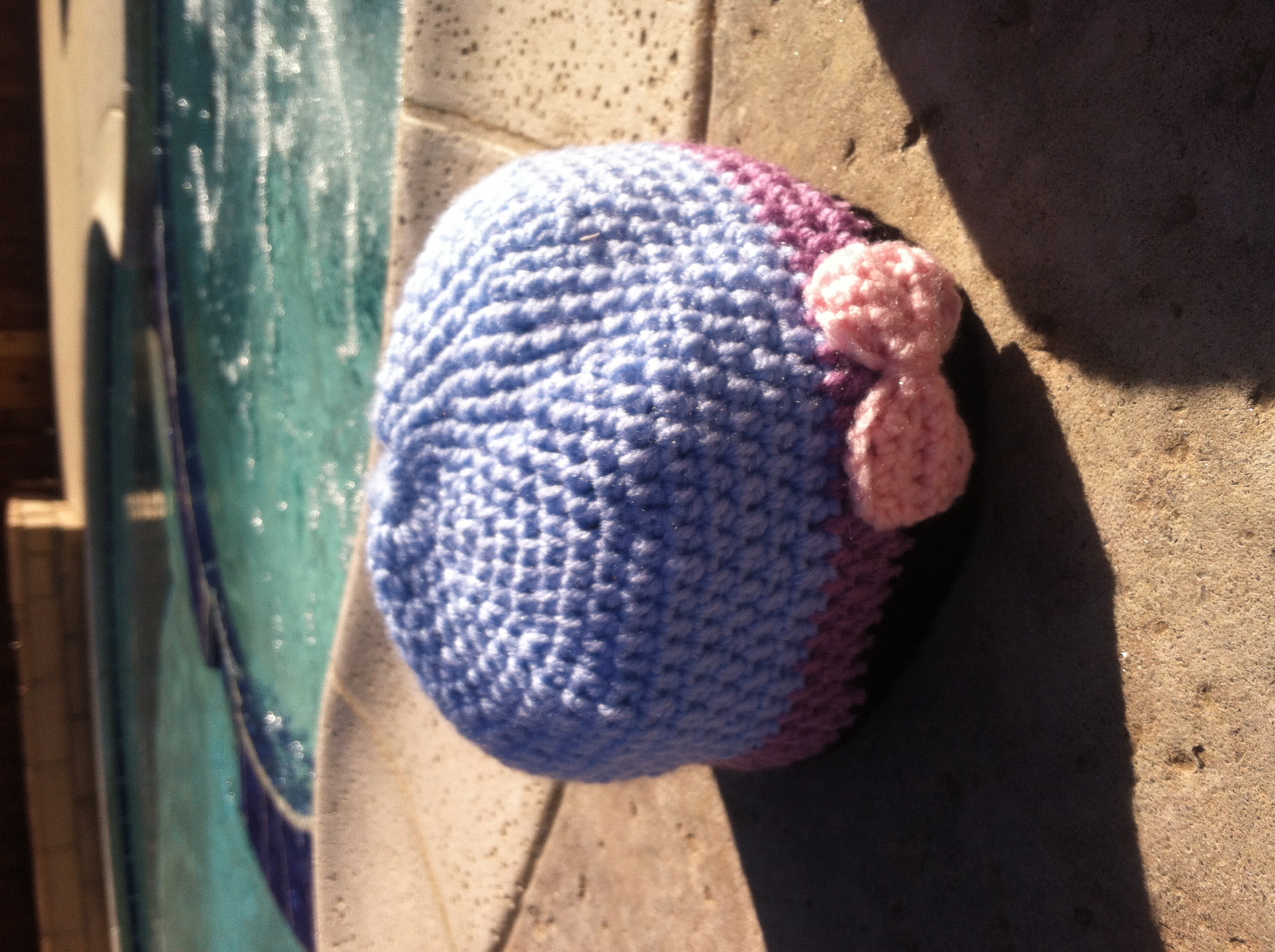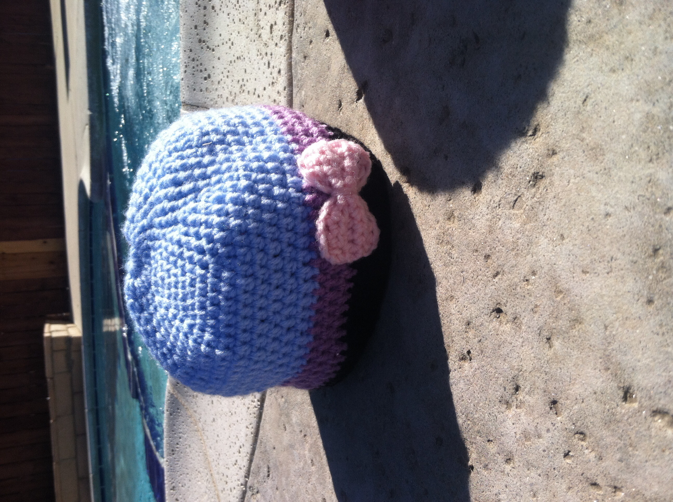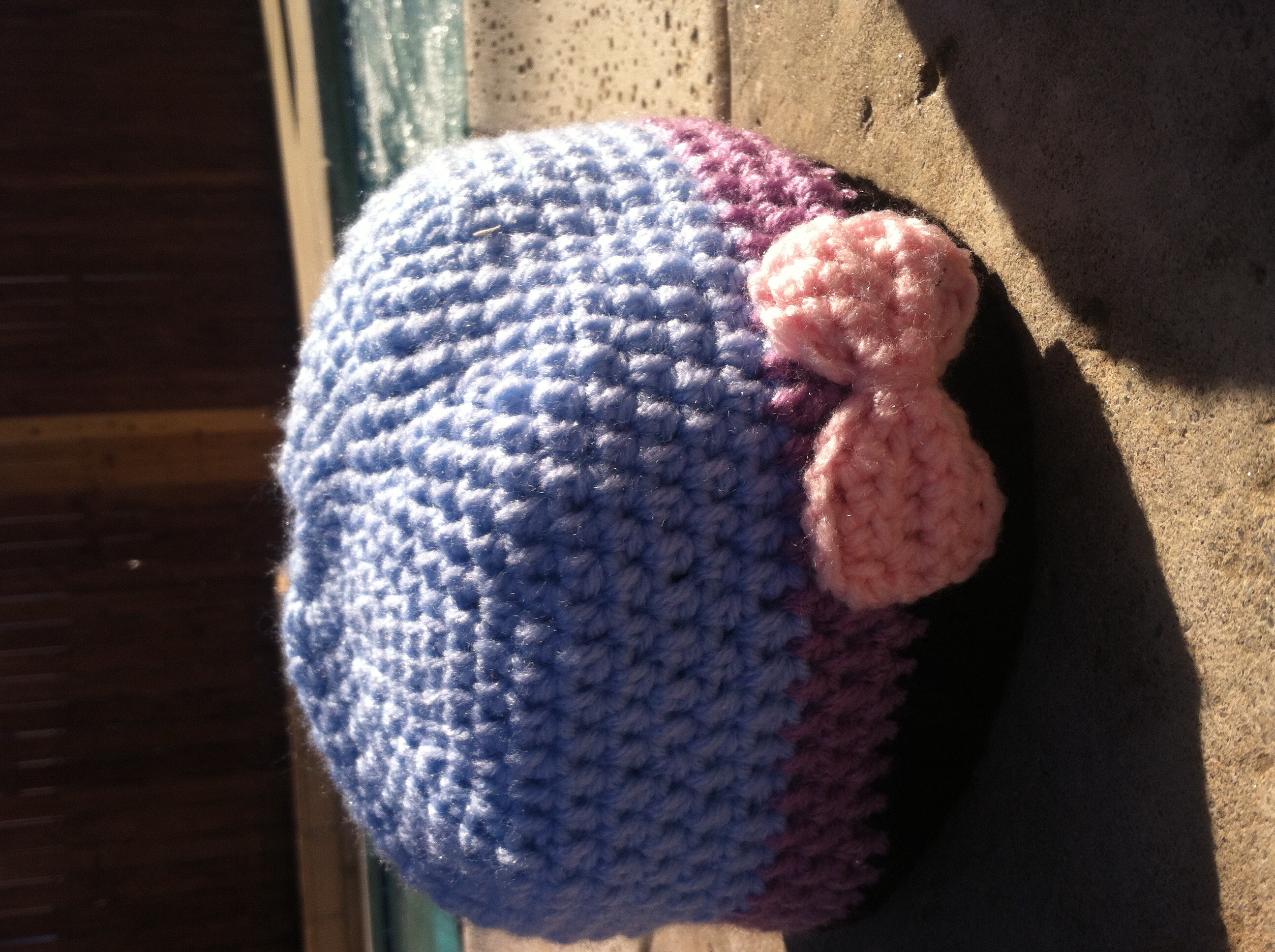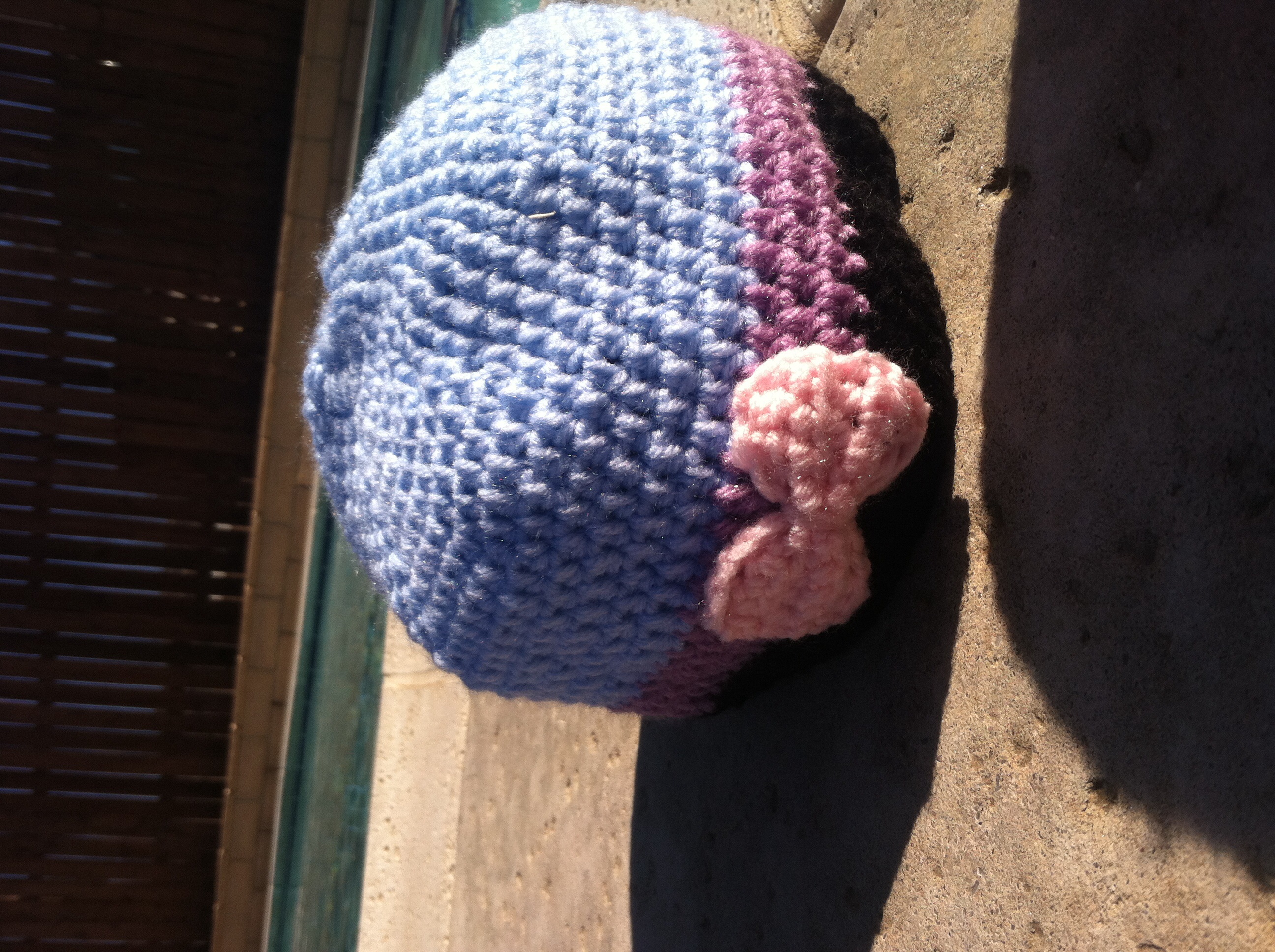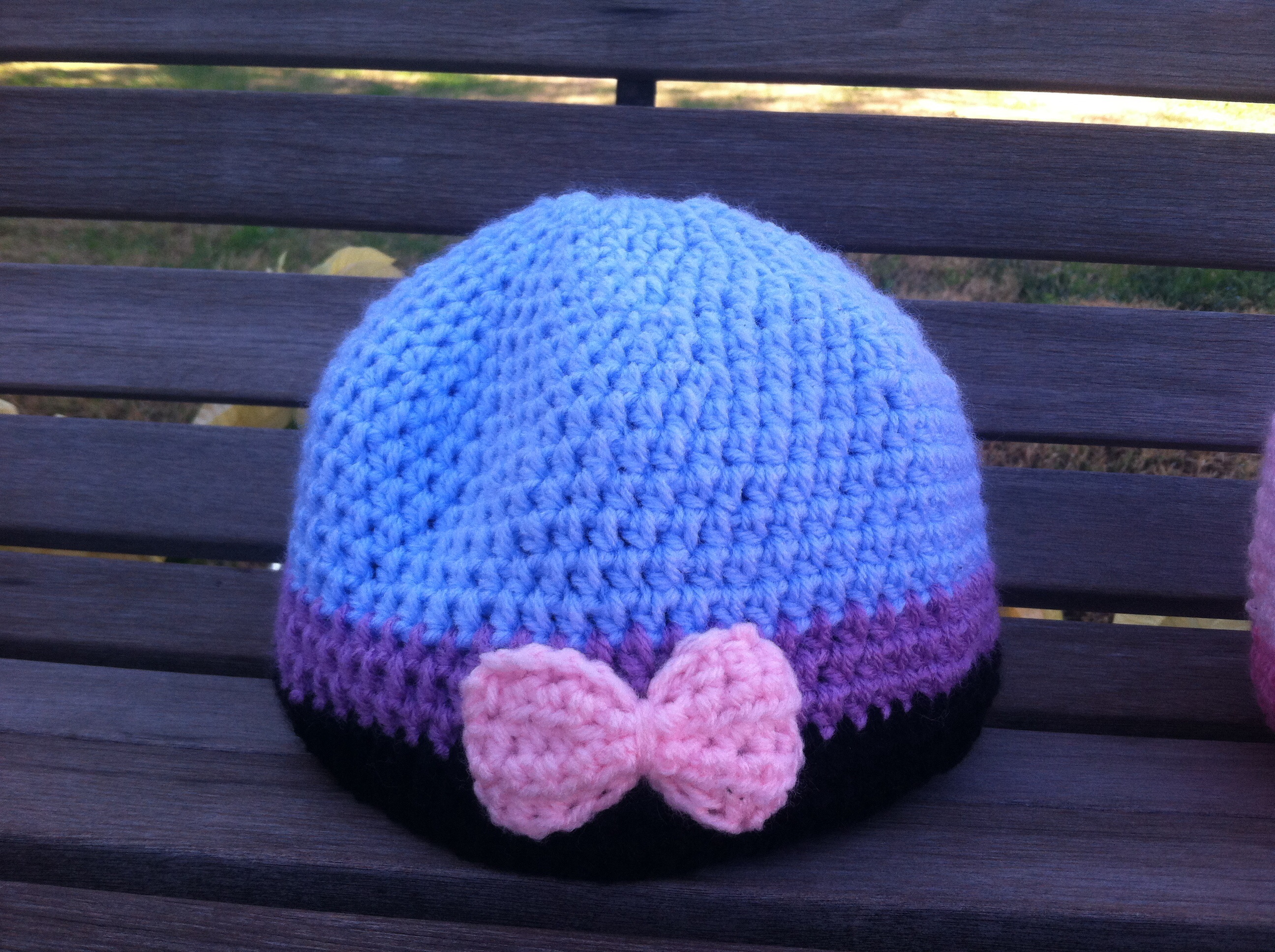 made with soft yarn in black, purple, blue, with pink bow. if you are getting this for a child please let me know age so I know how big to make it thanks