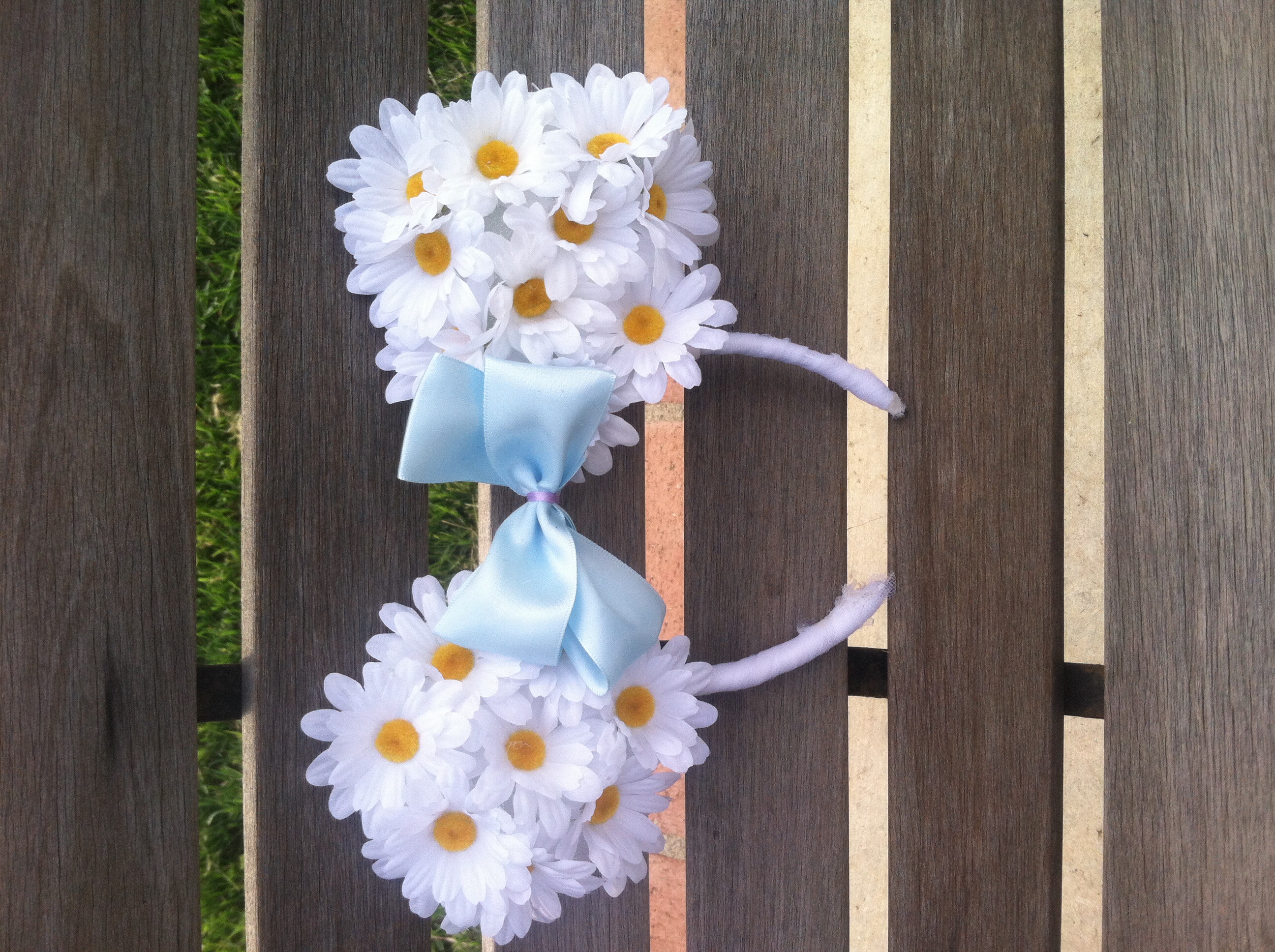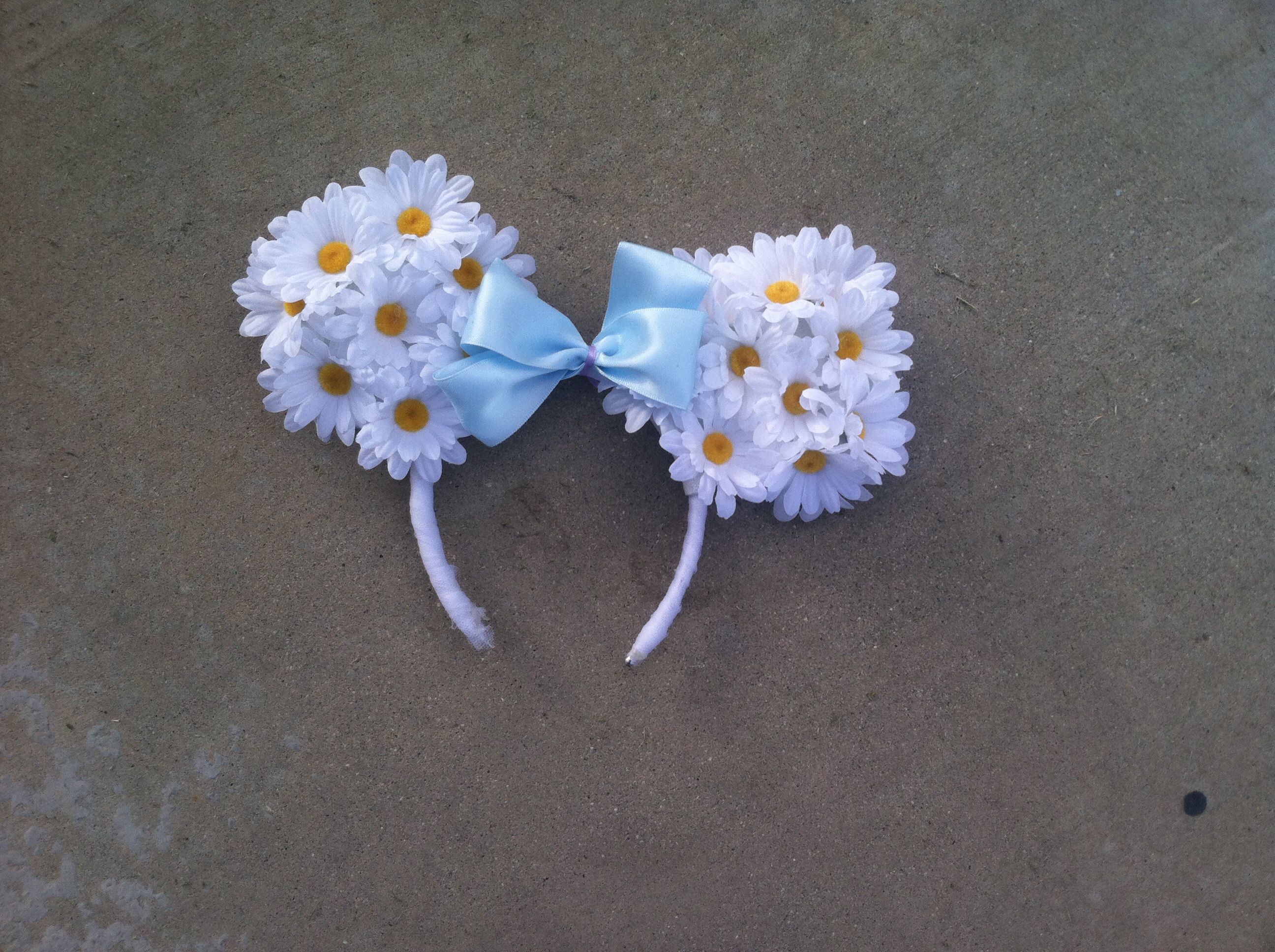 Disney inspired white ears with daisy flowers and blue bow the back of ears are glittery white perfect for a spring and summer day at the park